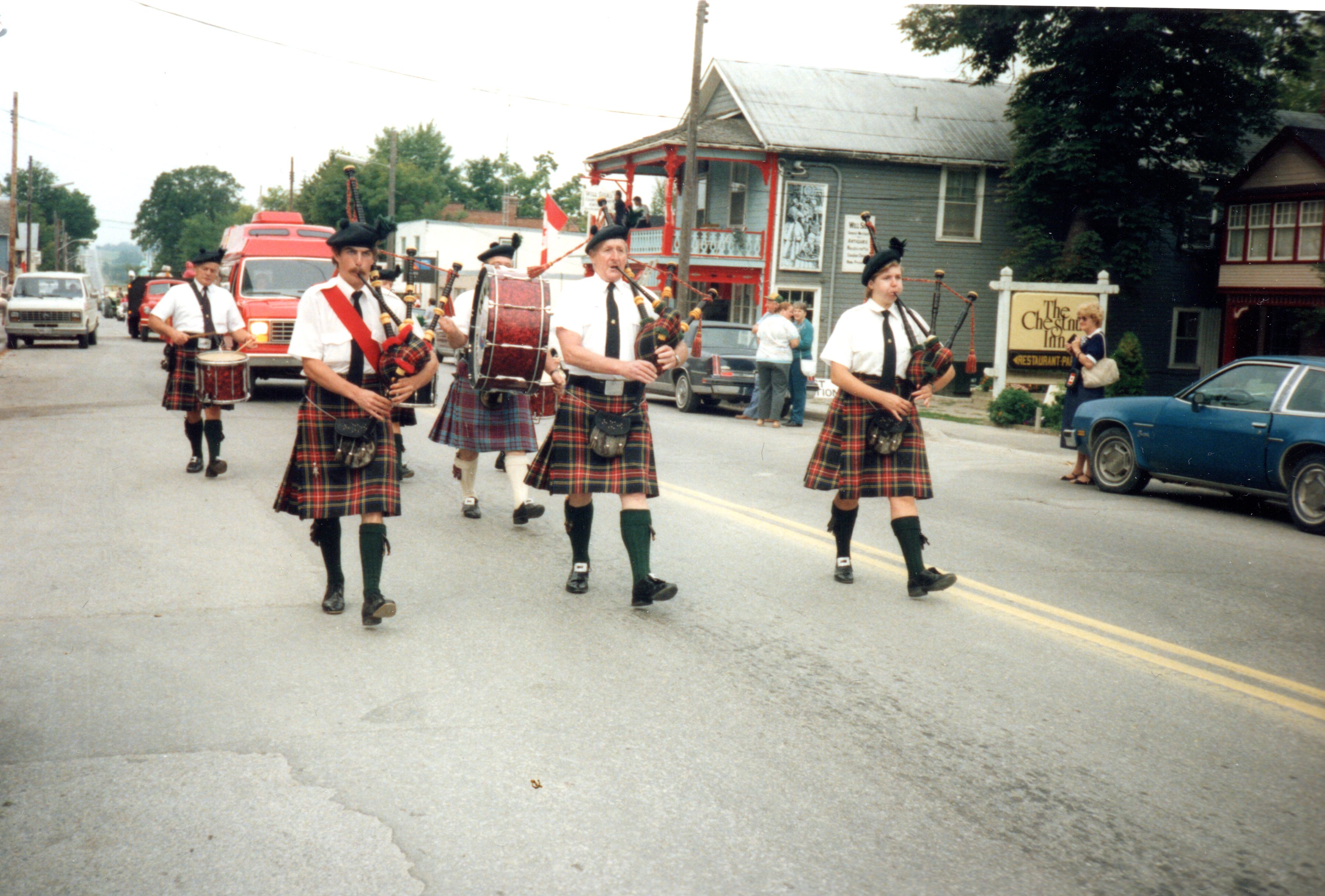 Image showing a piping band during a parade down Queen Street in Cookstown. The parade took place as part of the 130th Fall Fair.