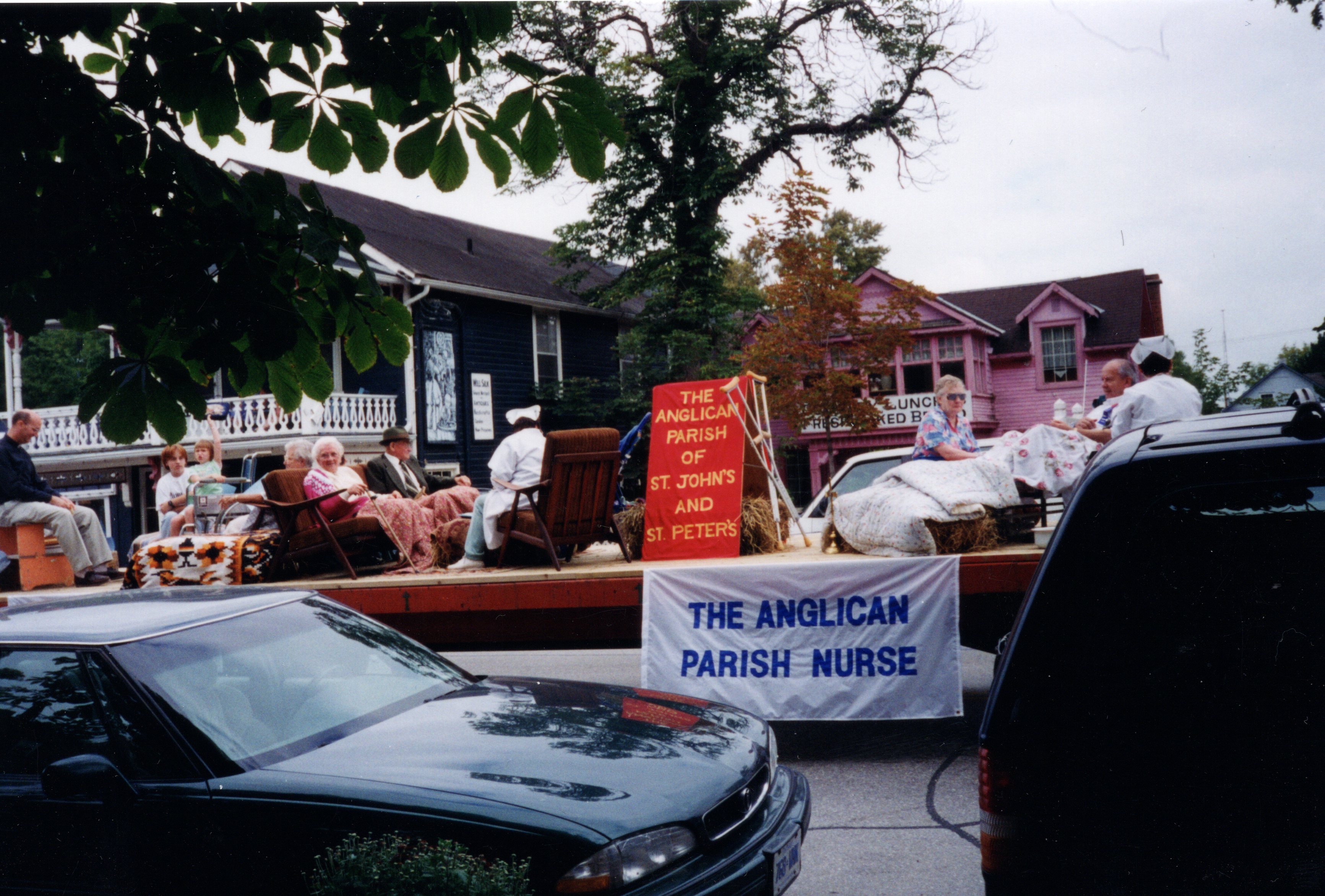 A float holding members of the St. John's and St. Peter's Anglican Parish participating in a parade in Cookstown for the Fall Fair.