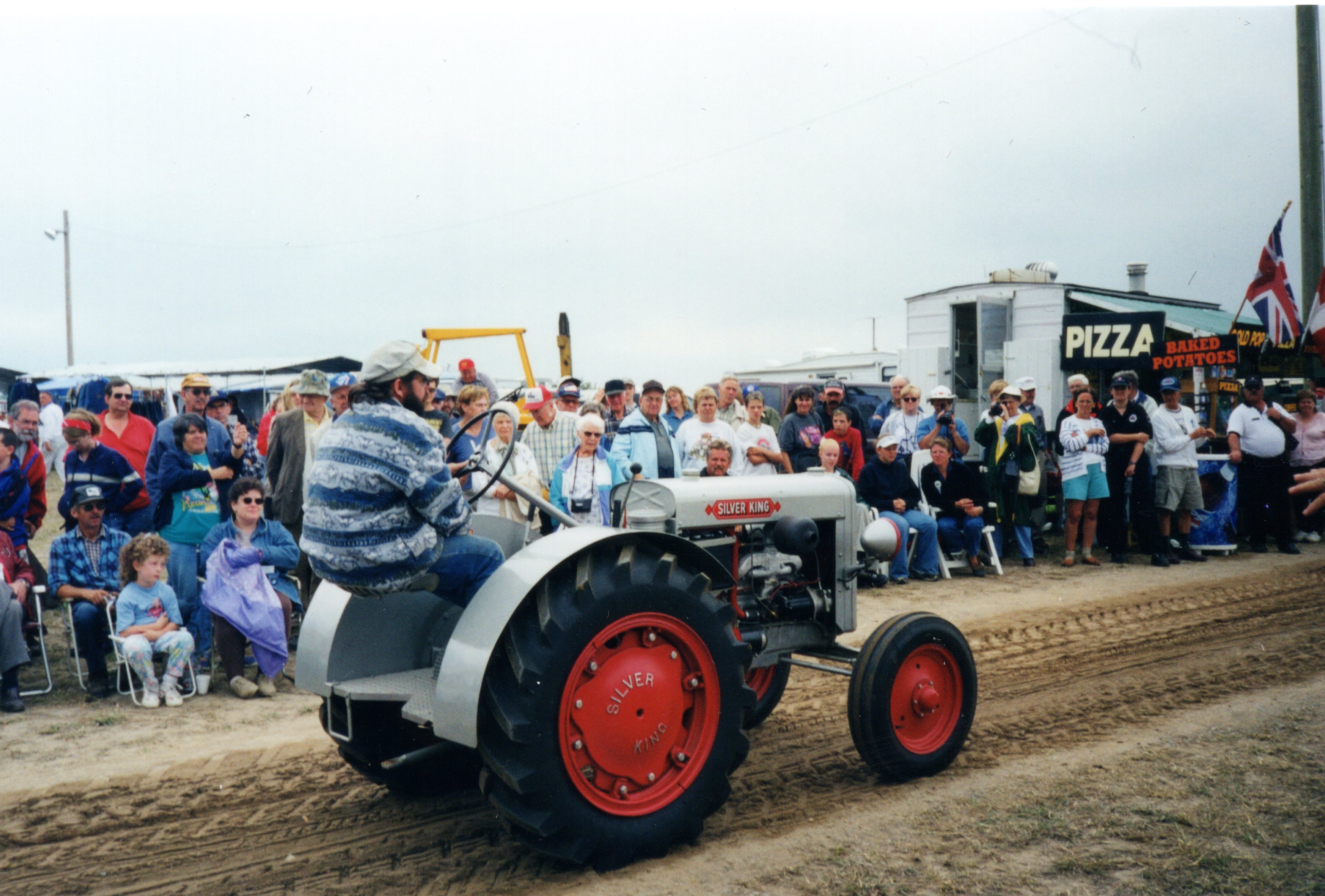 Image of a tractor driving along a sandy path, in front of an audience at the Agricultural Fall Fair on the Cookstown Fairgrounds. The tractor is a Silver King, painted silver with red wheels and decals. On the right side of the image there is a snack bar that sells pizza, baked potatoes, and cold pop. The snack stand is flying the Union Jack flag and Canadian flag.