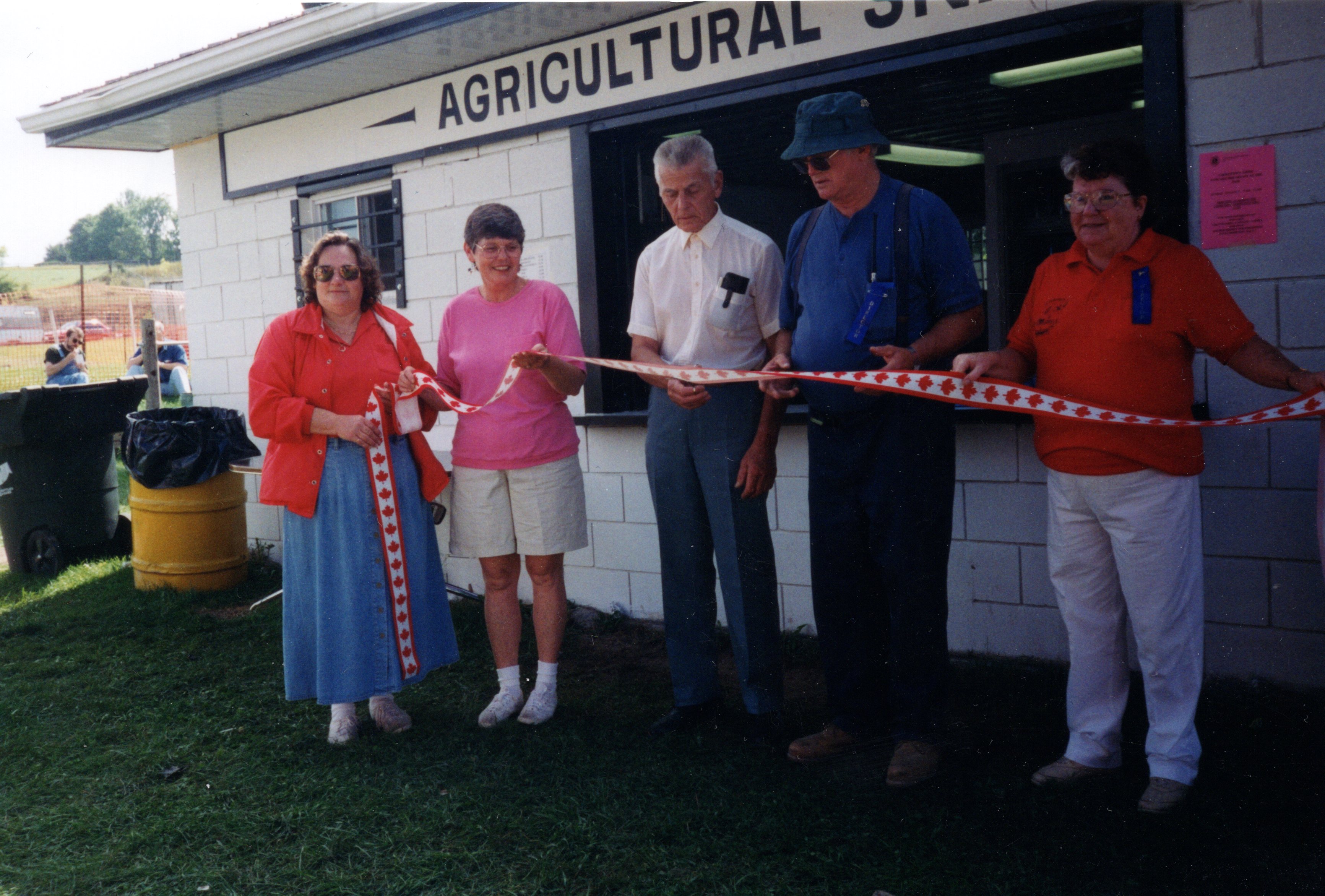 Image of five members of Cookstown Agricultural Society, standing in front of the newly rebuilt Agricultural Snack Bar following a fire. They are holding a maple leaf patterned ribbon across the five of them with Geoff Dawney (center) holding a pair of scissors to cut the ribbon, and officially open the snack bar.