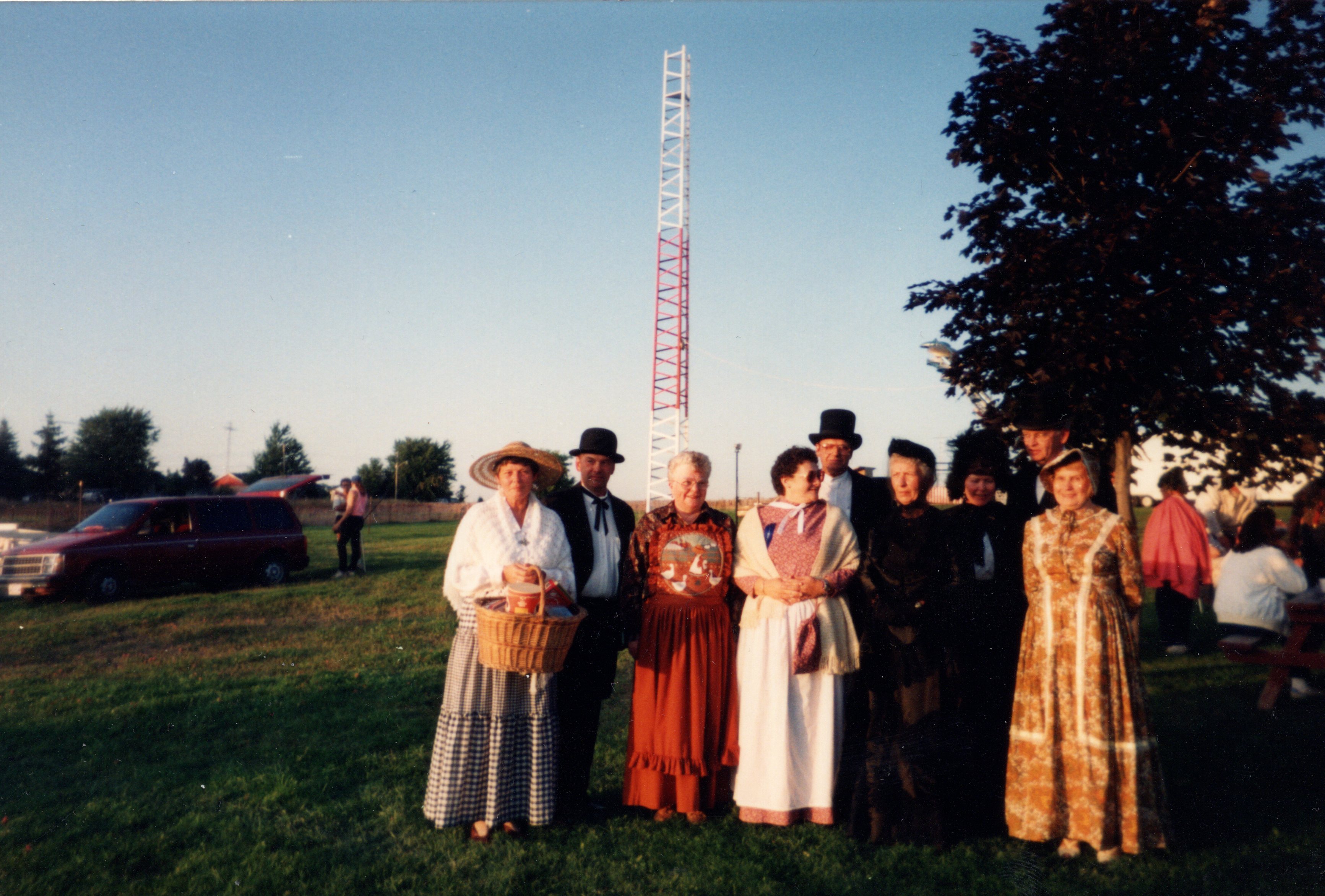 Image of nine unidentified people posing in Victorian period costumes at the Cookstown Fairgrounds. The women are wearing long dresses with bonnets, and the men are wearing black suits with top hats.