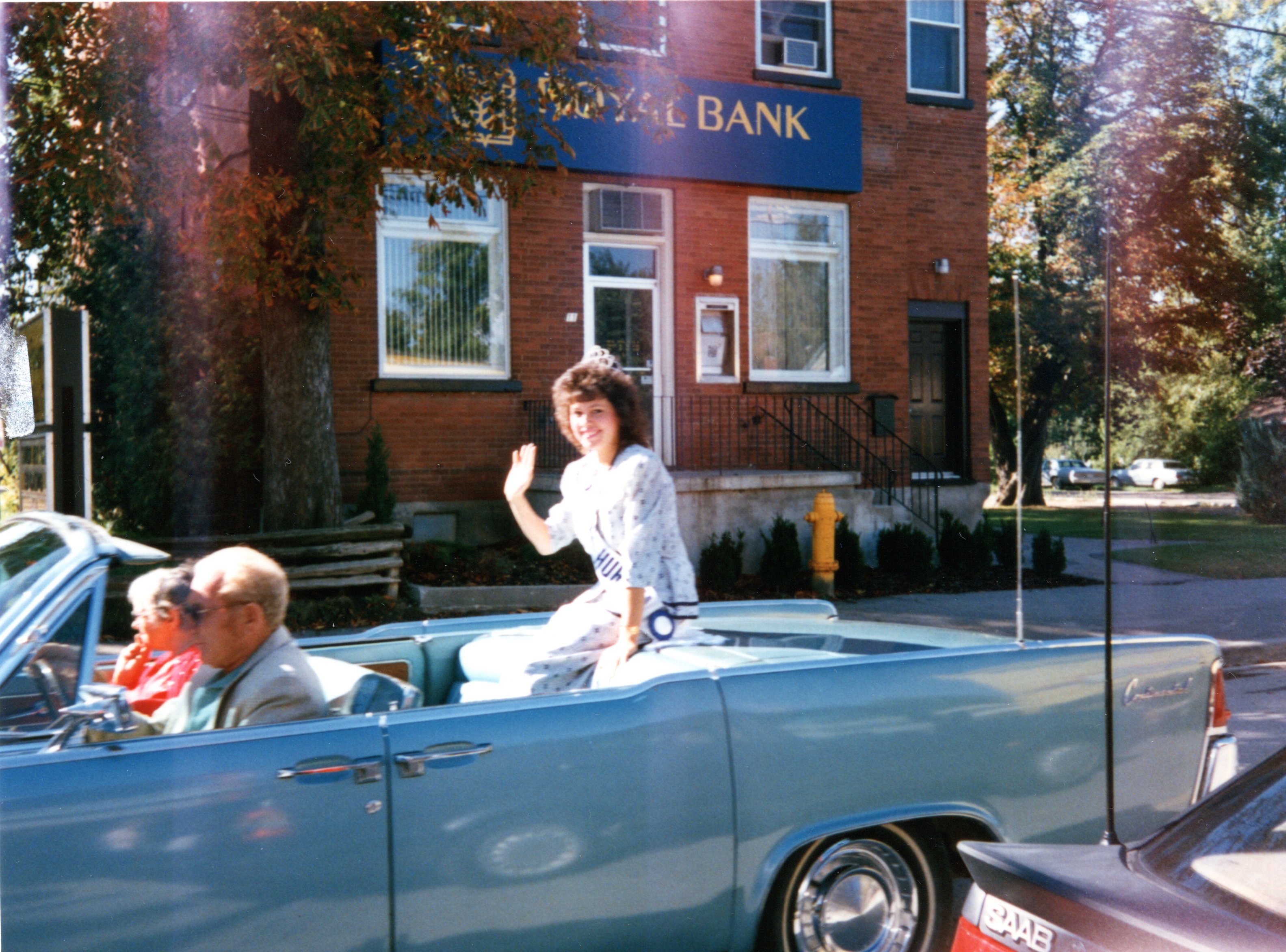 Image of a woman sitting on the backseat of a blue car with its roof down, wearing a sash and crown, waving during a parade through Cookstown. The car is driven by a man wearing a grey suit, and a women in the passenger seat. The Royal Bank is visible in the background.