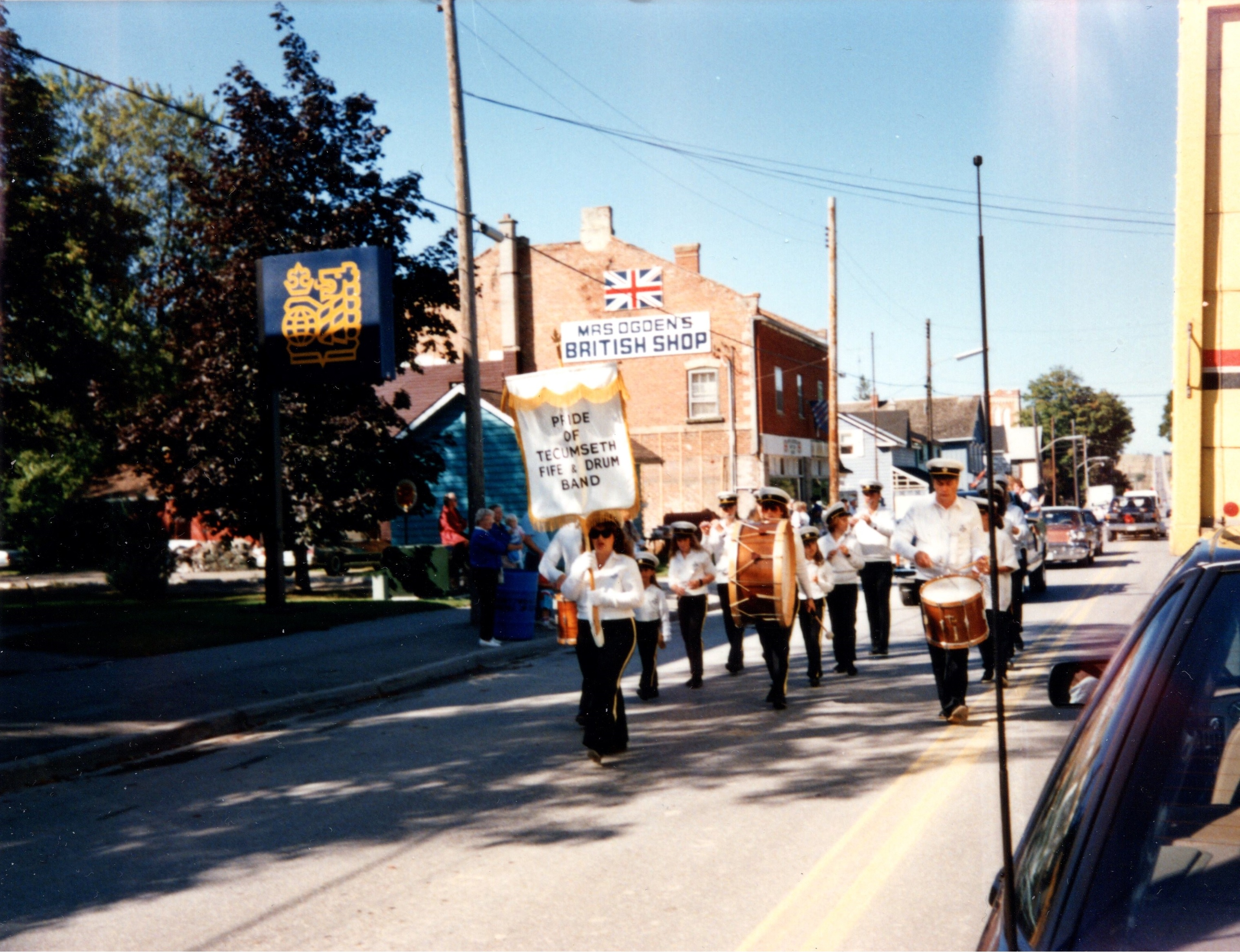 Image of the Tecumseth Fife & Drum marching band, led by a woman holding a banner that says "Pride of Tecumseth Pipe & Drum Band". The band is participating in a parade in Cookstown in 1989. A sign reading "Mrs. Ogden's British Shop" is visible on a red brick building behind the band.