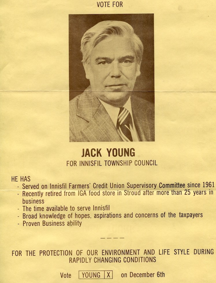 Promotional flyer advertising Jack Young's candidacy for Innisfil Township Council. The flyer reads: "Vote for Jack Young for Innisfil Township Council. He has served on Innisfil Farmer's Credit Union Supervisory Committee since 1961; recently retired from IGA food store in Stroud after more than 25 years in business; the time available to serve Innisfil; broad knowledge of hopes, aspirations and concerns of the taxpayers; proven business ability. For the protection of our environment and life style during rapidly changing conditions vote YOUNG on December 6th"