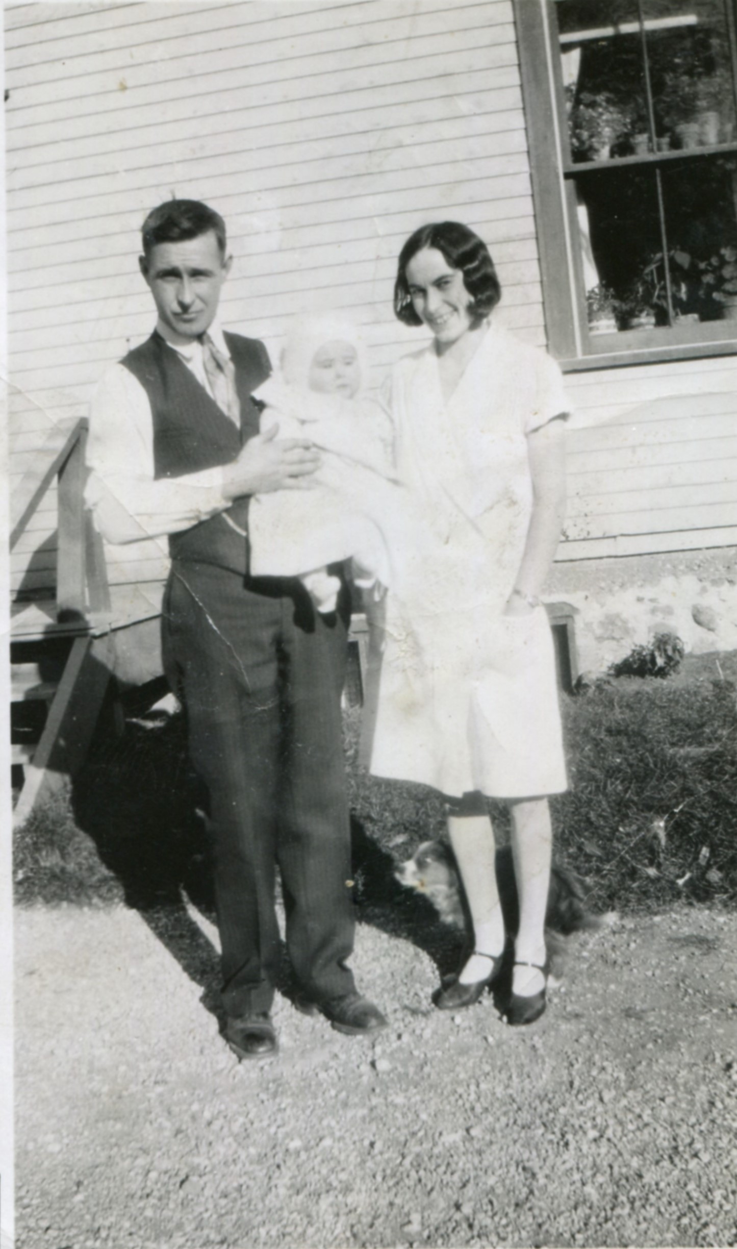Photo taken outdoors of Harold and Helen Wallace with their son, Ross Wallace, as a baby in Stroud, 1930.