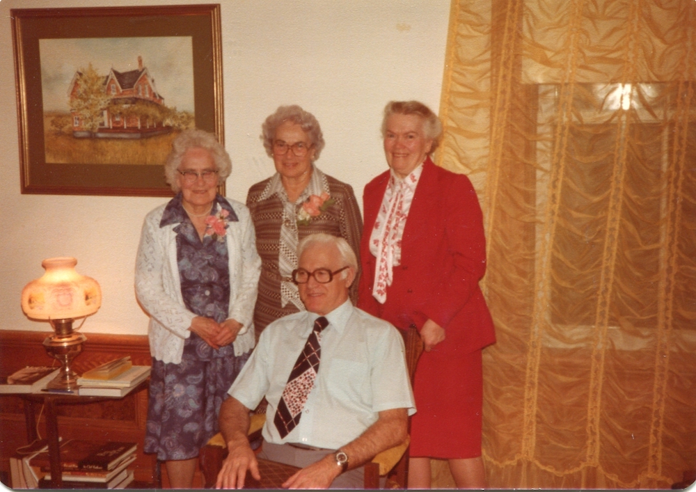 Colour photo of the Guest family taken indoors sometime in the 1960s or 70s. Pictured from left to right are Dora Martin (née Guest), Helen Wallace (née Guest), Mildred Irwin (née Guest), and Tom Guest (seated). The photo was taken indoors with a painting of a farm house on the wall visible in the background, with orange sheer curtains on the window and an antique lamp on a side table.