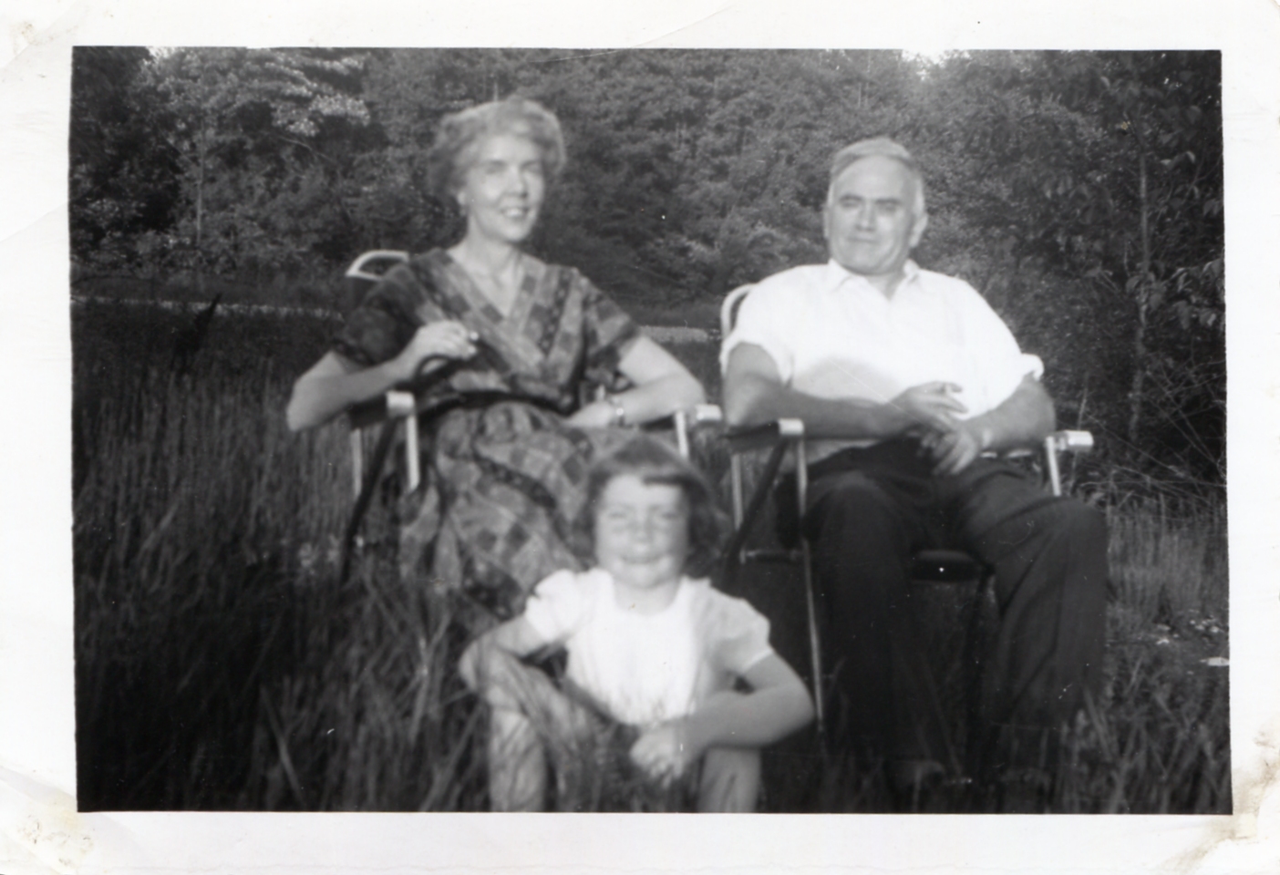 Black and white photo of Irene, Rex, and Lynda Lee Guest. Irene and Rex are both seated in folding chairs while Lynda Lee sits on the grass in front of them.