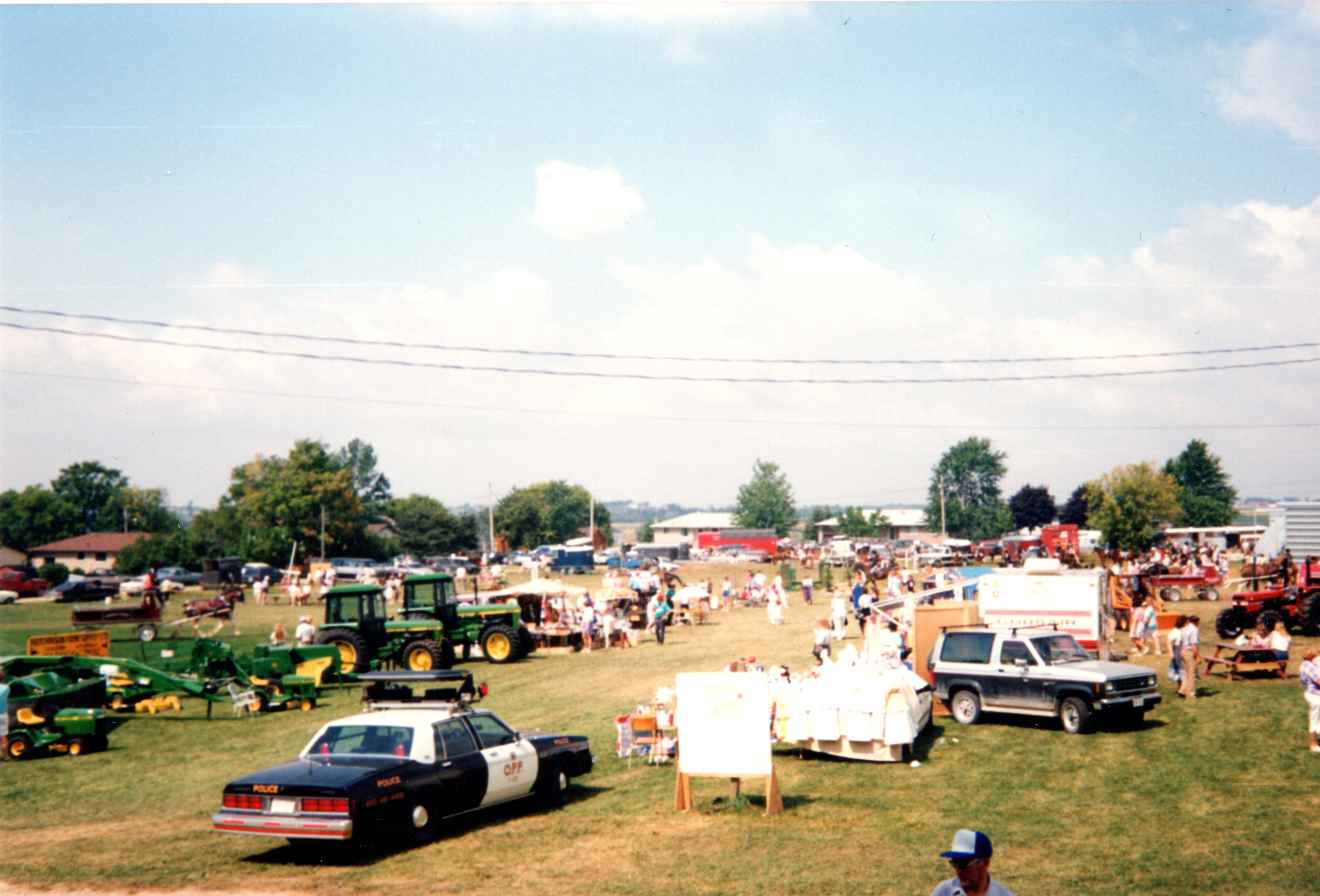 Image showing Cookstowns Fairgrounds with a number of John Deere tractors and farm equipment visible on the left side of the image, and different stalls and tables set up on the right with many people walking throughout. A police car is visible in the bottom left.