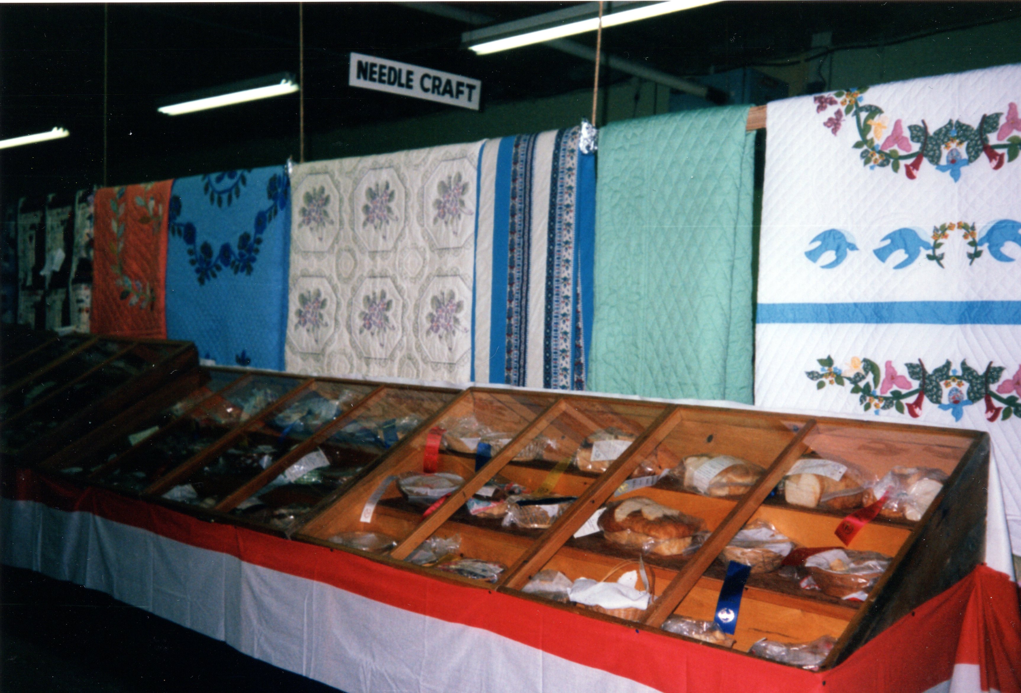 Image of a display case full of baked goods and breads from a contest held at the agricultural fair in Cookstown. Blue, red, and white award ribbons are visible on some entries. A number of quilts hang in the background.