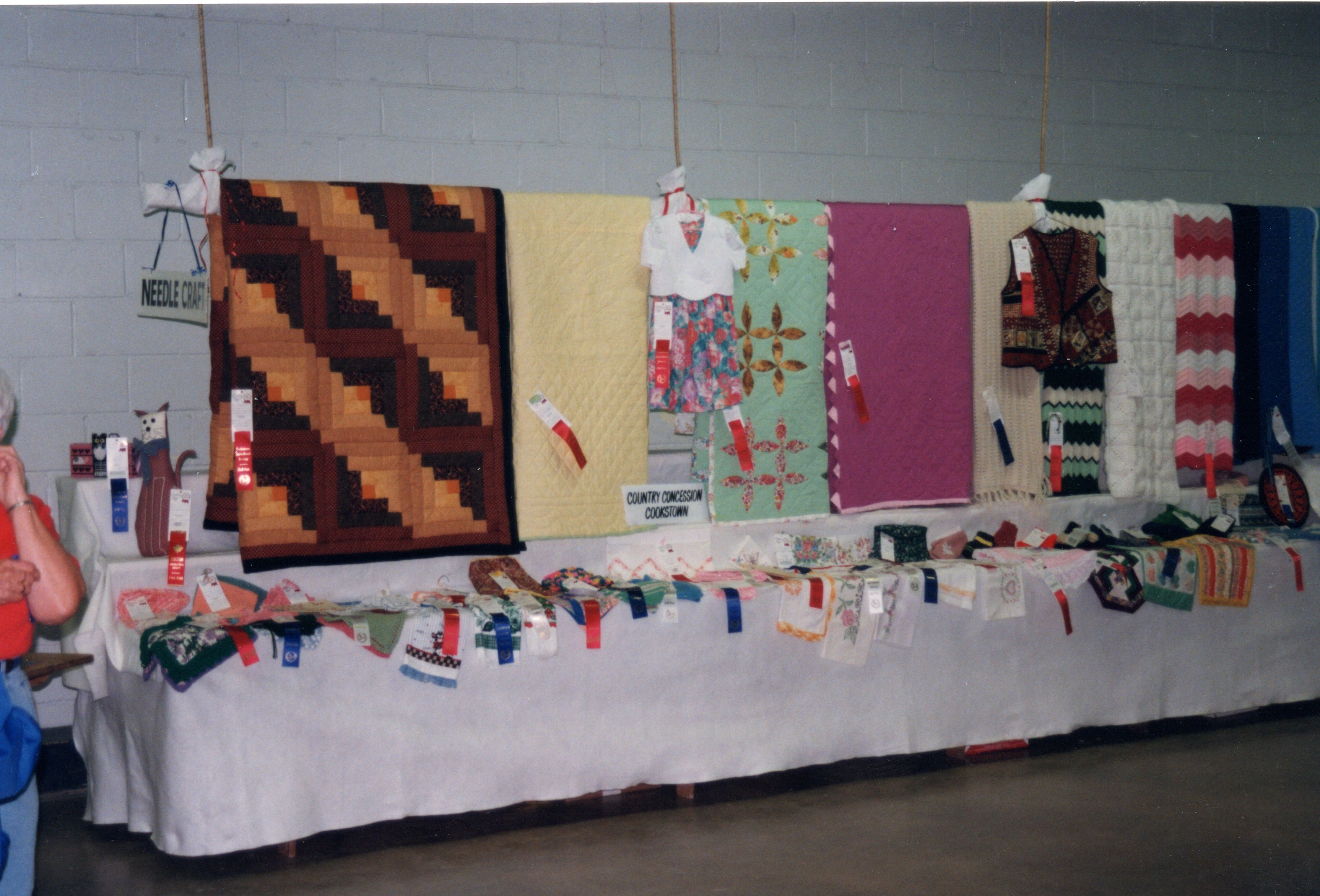 Image of a display of quilts, and other homemade goods that have award ribbons on them. Photo taken during a fair at the Cookstown Fairgrounds.