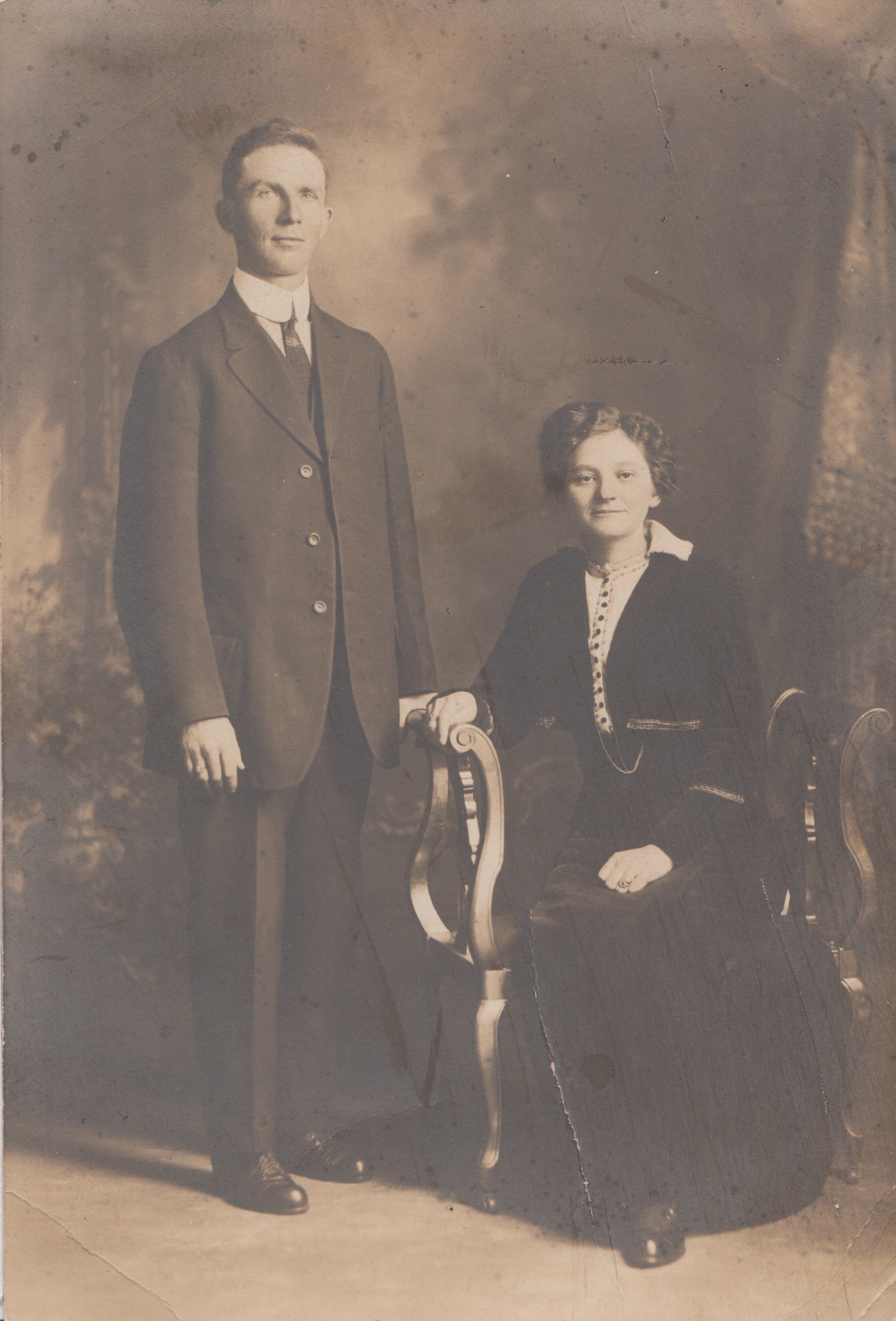Wedding portrait of Scott Sharp and Luella Greensides, who were married on 3 June 1908. The photo was taken in a studio with Scott wearing a suit and standing on the left, and Luella wearing a dark dress, seated in an ornate chair.