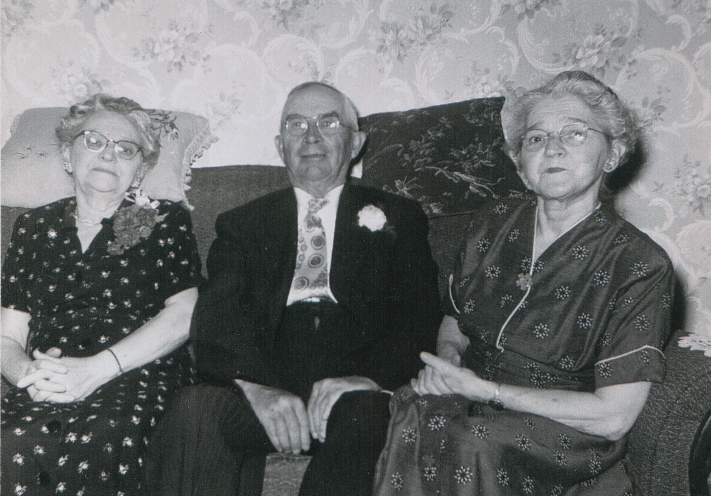 Black and white photo taken in June 1958 of three people seated on a couch. From left to right are Luella Sharp, her husband Scott Sharp, and Ada McMaster. Luella and Ada were sisters, both the daughters of Peter Greensides. Both women are wearing short-sleeved dresses, Scott is wearing a suit jacket with a boutonnière and Luella has a corsage, and all three are wearing eye glasses.