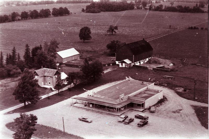 Aerial photo of the Stroud Plaza taken in the 1960s. The photo shows Young's grocery store in the centre with a farmouse nearby, a large barn behind, and another outbuilding behind the farmhouse. Several cars are parked in the store's parking lot area, and several large fields are visible, divided by roads and trees lines.