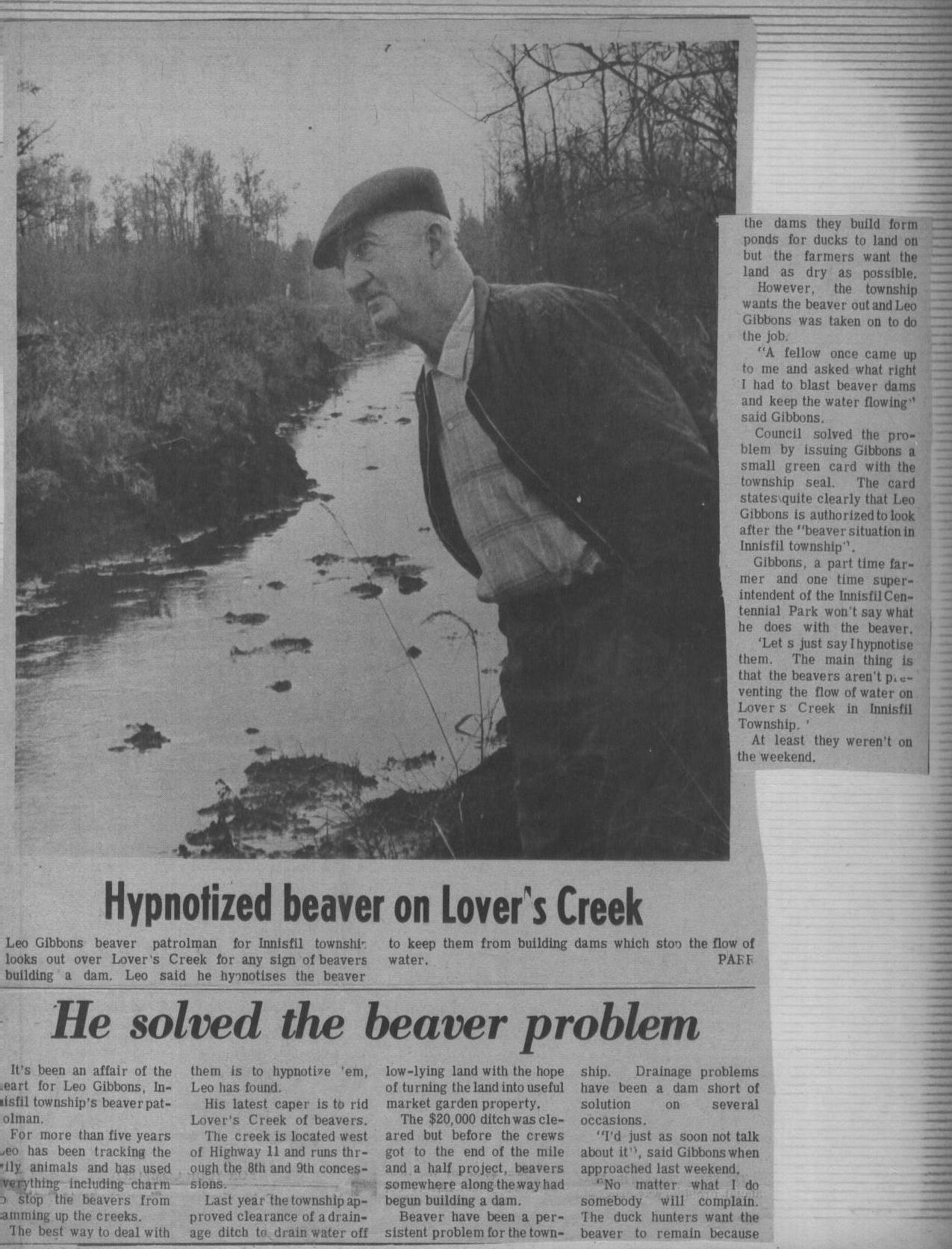 Undated newspaper clipping titled "Hypnotized Beaver on Lover's Creek", which tells the story of Leo Gibbins, the self-appointed beaver patrolman for Innisfil Township, who 'hypnotizes' beavers to prevent them from building dams. The article also features a photo of Leo in a plaid shirt, jacket, and cap, looking out onto Lover's Creek.