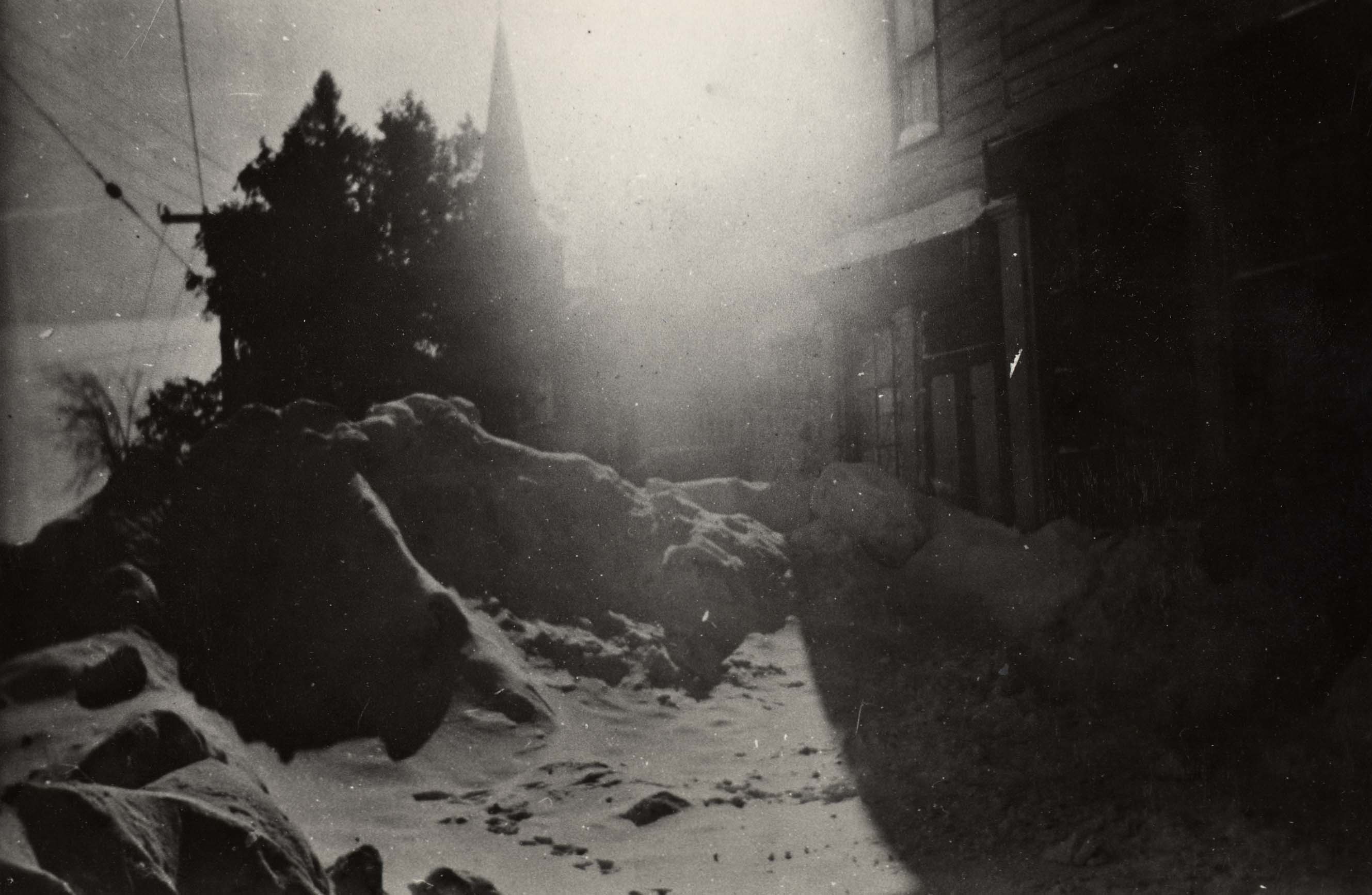 Innisfil Township Office, circa 1930, during a snow storm, southwest corner Churchill. - it was known as the old Sloan building, in the family for over 100 years; - was home of James Sloan who settled in Churchilll in 1850; - was demolished by Gregg Davis in 1947.
