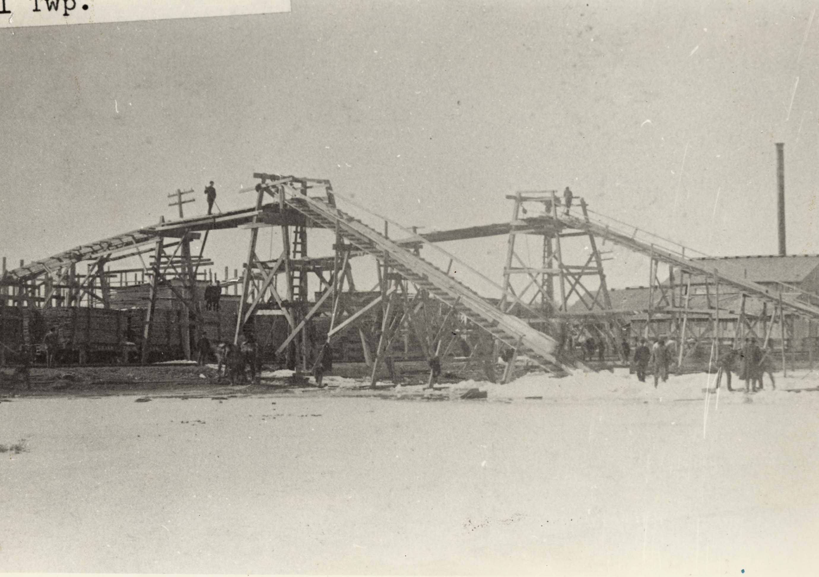 Photo of the mechanized ice loader and conveyor used by the Belle Ewart Ice Company to transport large blocks of ice from Lake Simcoe into ice houses for storage or directly onto train cars for shipping. The photo shows two large side-by-side structures with numerous men visible at the base of the conveyors, directing the ice blocks with long poles, as well as a man at the top of each structure to help reposition blocks that may have shifted on their way up. The Belle Ewart Ice Company was the first of three large companies that used Lake Simcoe to supply ice to homes throughout Ontario and some of the northern United States.