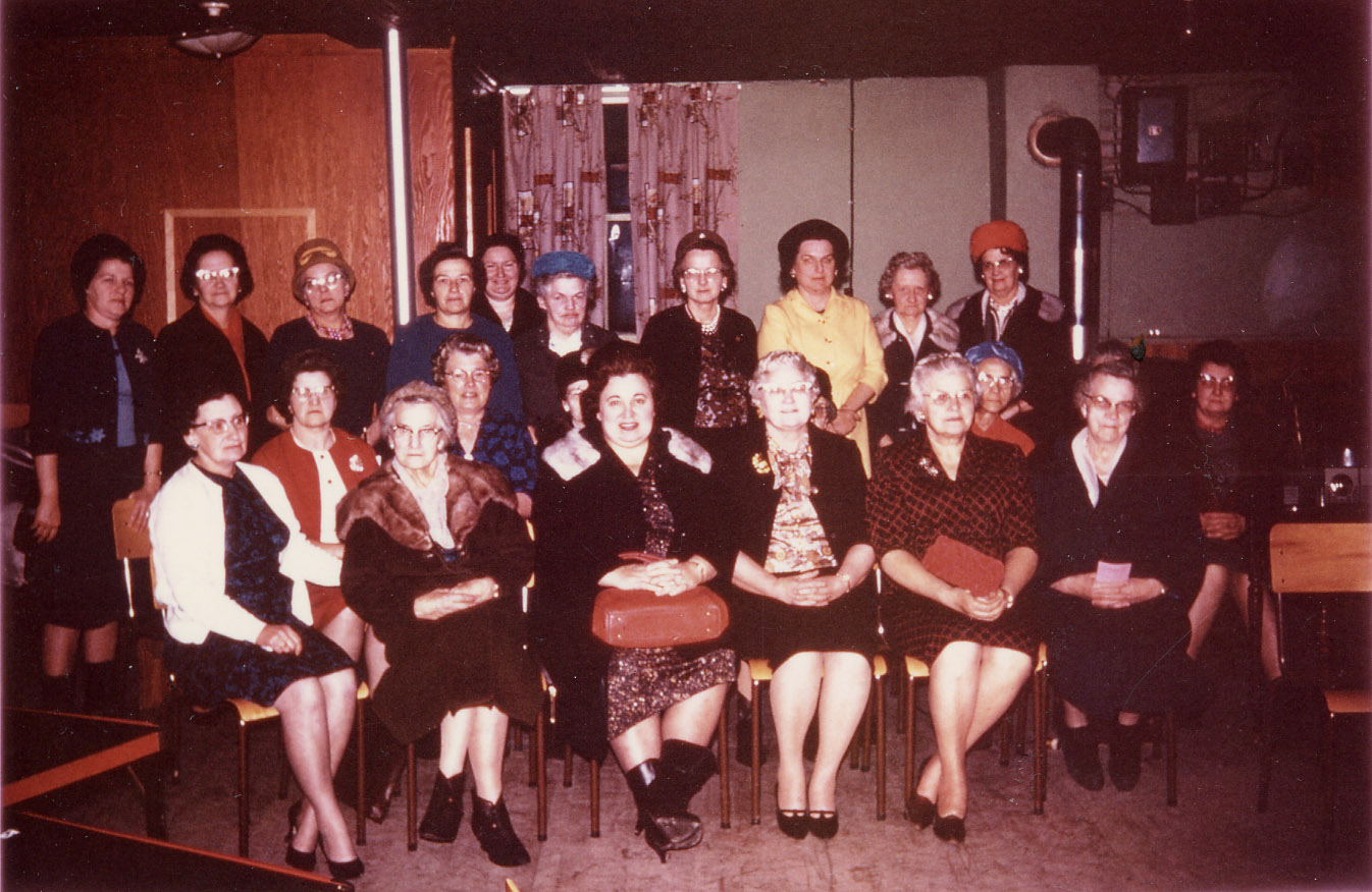 Group photo of the Cookstown Women's Institute in 1965. The members are dressed predominantly in dresses, some with coats and hats on, and the picture appears to have been taken in a basement meeting area. Pictured from left to right, back row: Mrs. Lena Lund, Mrs. Alice Baker, Mrs. Hazel Trotter, Mrs. Parker [m. Harold], Mrs. Ruth Draper, Mrs. Eva Patton, Mrs. Marj Hansen, Mrs. Kelly [m. William], Mrs. Dell Evans, and Mrs. May Hopper. Middle row: Mrs. Elizabeth "Lil" McCoriston, Mrs. Susie Roulston, Mrs. Ross [m. Leonard], and Mrs. Muriel Smith. Front row: Miss Irene McMaster, Mrs. Jo Kidd, Mrs. Ann Monkman, Mrs. Keatha Riley, Mrs. Gertrude Pinkney, and Mrs. Laura Mayes.