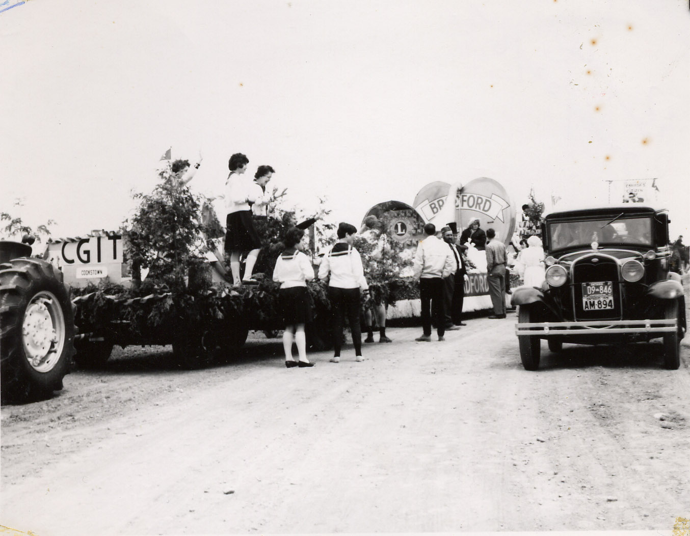 The C.G.I.T. Girls and their float as it waited after the parade at the Fair grounds to be judged. Also the Bradford float and old car. Mrs. George Faris and the Wright girls are to be seen.