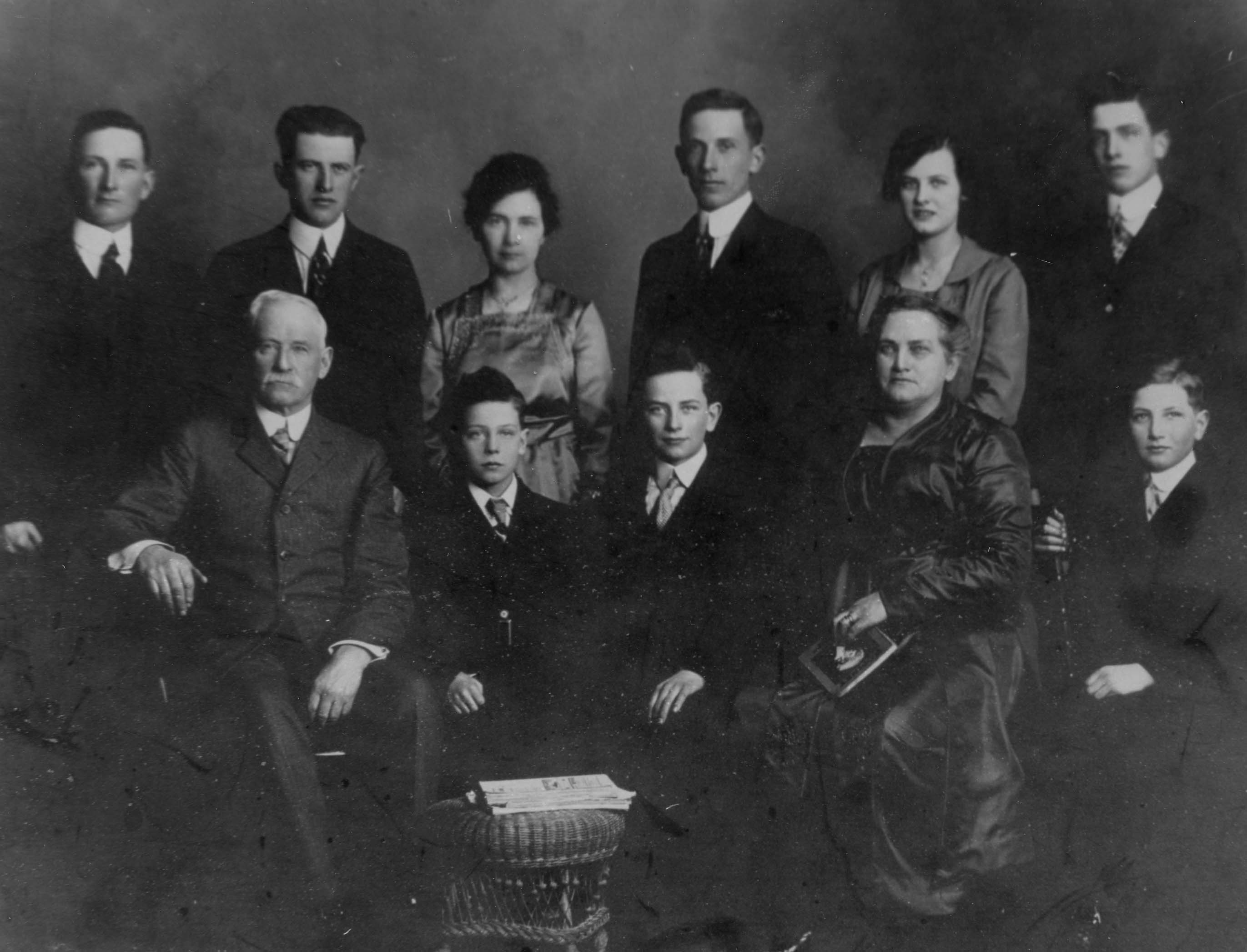 Back: l to r - John (1892-1943), Robert (1899-) Ida (1890 -)Mrs herb. Hussey Seymour (1894) Erthel (1901), Mrs Robt. Mckenzie) Frank (1904-) Front l to r - William (1859 - 1941), Clifton (1910 -), Clarence (1906-), Mrs William Kell (1868-1931) (Lavinia Sawyer) Theodore (1908-).