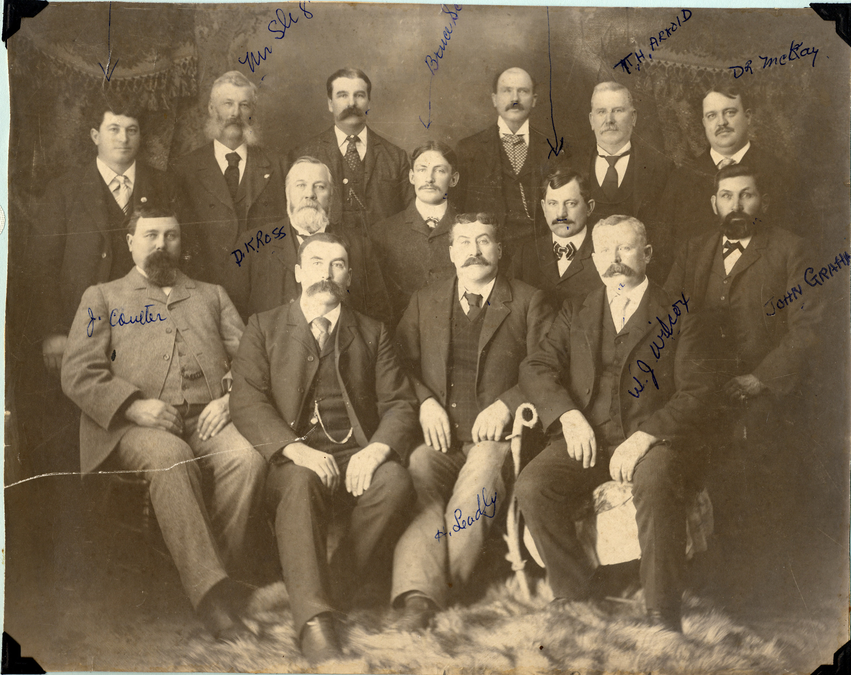 Group studio photo of the members of the Cookstown Agricultural Society at the turn of the century. The men are all dressed in suits and waistcoats and all but one have a moustache or beard. They are positioned in three rows, with the back row standing and the others seated. Pictured from left to right are: Lee Banting, Alex Morrison, W. Drennan, Dan Kidd, Thomas Arnold, and Dr. Alex MacKay. Centre row: Dan Ross, Bruce Scott, Joe Banting, and John Graham. Front row: James Coulter, J. Drennan, Henry Leadlay, and Treasurer C.H. Willoughby, 1903-05. The photo was taken by T.A. Adams, Photographer, of Cookstown.