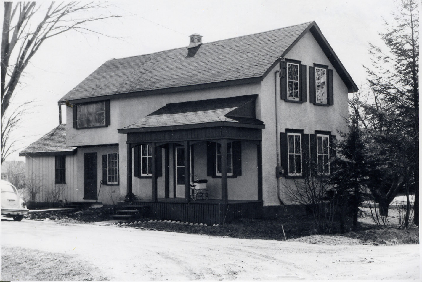 Photo of a two-storey white stucco house on 2 Empress Lane, Cookstown, that was built around 1880. It was first inhabited by the Ashbury family, followed by Bob and Harriet Dutton and their son Gordon until 1944. Mabel Moir, her brother Edgar Moir, and nephew Clarence Copeland moved in the same year. Mabel and Edgar were the children of Innisfil pioneers Jesse and Clara Moir. After Edgar passed away, Mabel and Clarence moved to a smaller home on Wellington Street. Clarence died 3 October 1973 at age 61, and Mabel died on 23 March 1990 at age 101. Mabel was honoured with the title of Citizen of the Year by the Bicentennial Committee in 1984 along with Jack Baker. Len McAfee purchased the home after the Moirs left and in 1971 split the lot and built a brick home on the western portion. A Mr. Scruton purchased the home and remodelled it, and in the same year sold to Jim and Astrid Wilcox. In 1979 Brian and Margaret Ashley purchased the home. The house itself has a small front porch and dark trim and shutters on the windows. The back of a car is just visible on the far left of the photo.