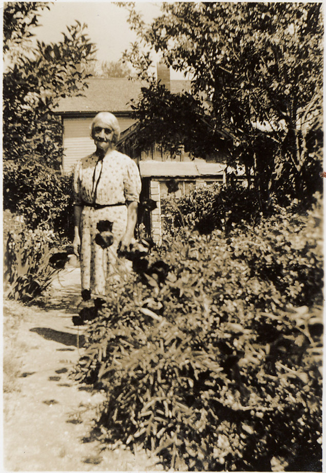 Miss Minnie Spence in her garden at the back of the building. (Next west of the bakeshop)