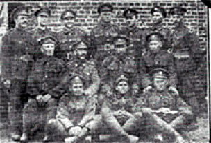 Photograph scanned from the Barrie Examiner newspaper depicting a group of soldiers from the front, likely during World War I. The original caption was: "The above group of some Simcoe soldiers has reached The Examiner from the firing line. They are from left to right as follows: Top Row- Geo. Purchase, Geo. Armstrong, Earle Davis, R. Greaves, N. Campbell, P.V. Kennard, J.F. Mindham. Centre Row- L. McClean, Geo. Lowe, H. Fraser, J.C. Fitzell. Bottom Row- W. Sommerville, Rex Chappell, C. Robertson." The entire group are dressed in their uniforms. The front row is sitting cross-legged, the second row is seated on chairs, and the back row is standing.