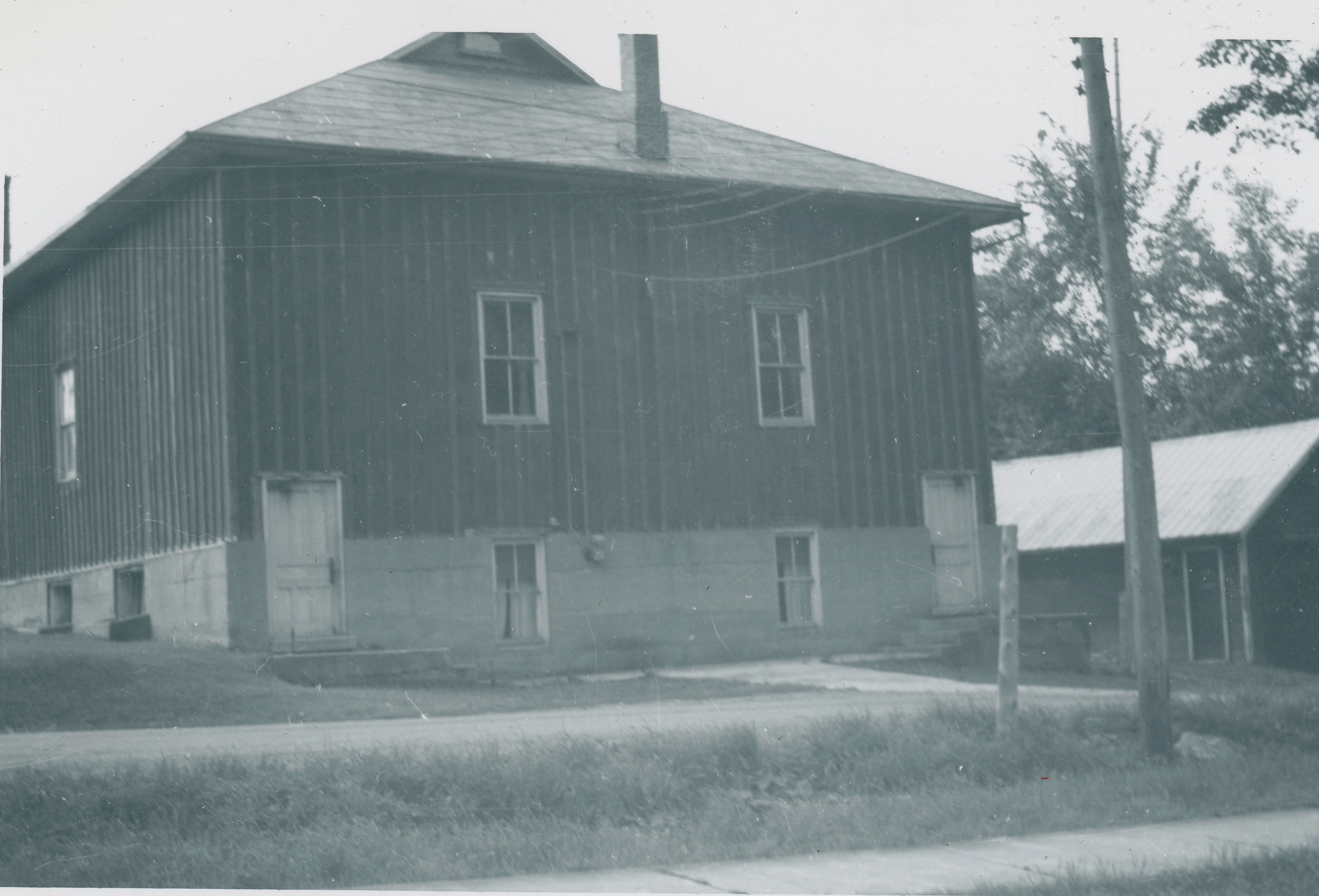 Photo taken of the Cookstown Town Hall in 1961, which remained largely unchanged since 1923. A new side entrance was added in 1972 to eliminate the need for stairs, and the interior was renovated in 1976 with the addition of hardwood floors and a furnace, as well as a cement floor poured in the basement. The upstairs space was used for town meetings and eventually South Simcoe Theatre productions. The building became the Theatre's permanent home in 1983. The photo shows one side of the rectangular building with vertical siding, Dutch gambrel roof, and two worn white doors.