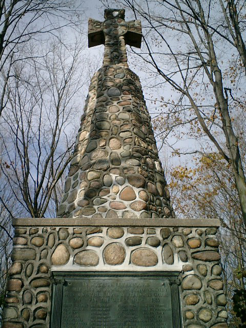 Photograph taken in 2003 of the Cookstown Cenotaph in Veteran's Memorial Park, located beside St. John's Anglican Church and in front of the Cookstown branch of the Innisfil Public Library. The centotaph is a small tower constructed of field stones with a cross at the top, and a plaque at the base bearing the names of Cookstown soldiers who died in the first and second World Wars.