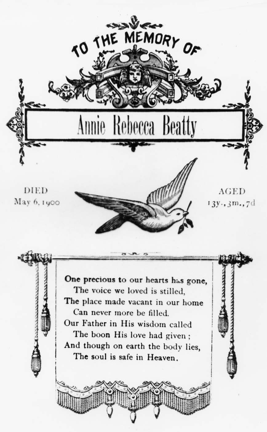 TO THE MEMORY OF: Annie Rebecca Beatty. Died May 6, 1900, Aged 13 years, 3 months,7 days