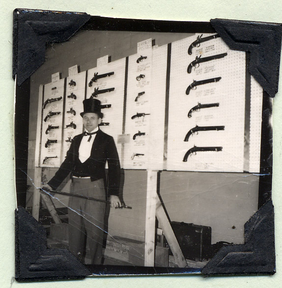 Photograph of a gun collection display from Orangeville for the Cookstown Centennial. The guns appear to be older style handguns and they are mounted with descriptions beside each one. A man dressed in a top hat and coattails stands in front of the display holding a cane.
