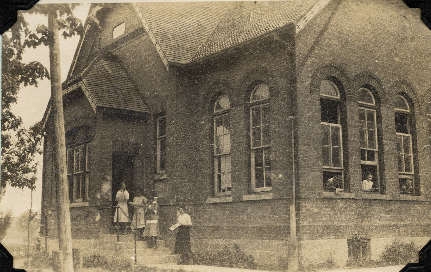 Photo taken of the Cookstown Public School some time before the addition of the High School was built. The photo shows three pupils standing on a small staircase to a doorway at the front of the building with the school teacher standing at the foot of the stairs. Three other students are leaning out of the windows on the right side of the building. The school itself is a large brick structure with an open gable roof.