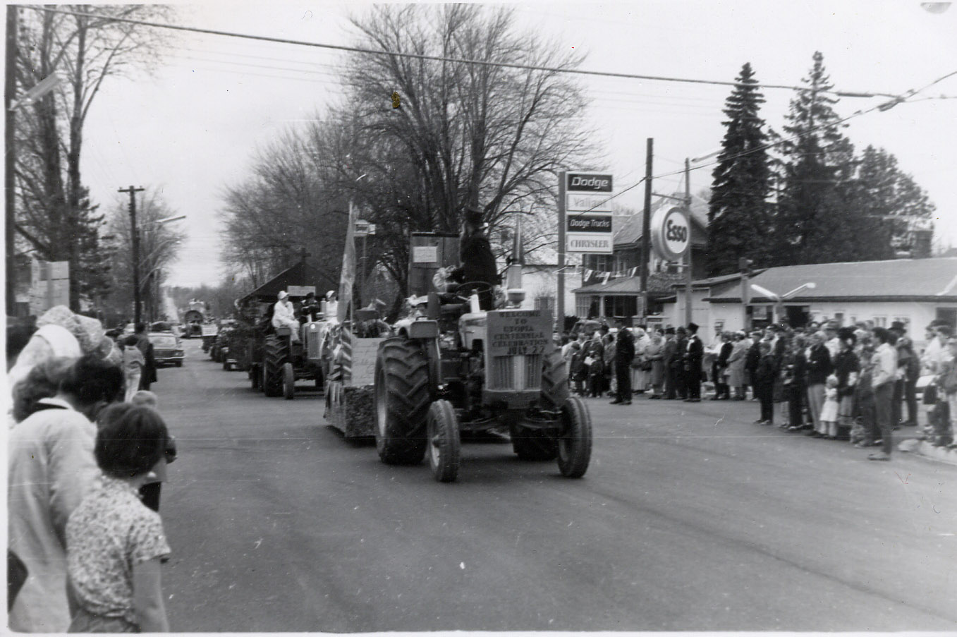 Tractors are used to draw the floats in the Centennial Parade. This picture taken at the intersection of Highways 27 and 89 with some of the crowd of spectators looking on. Many of the large trees along the road were removed in 1972 when the highway was widened and paved.