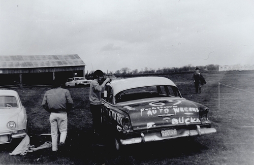 Photo of Danny Campbell and Paul Trotter preparing a car for a wrecking contest, most likely as a part of the Cookstown Fair in Fall 1967. The trunk of the car has been spray-painted with the number 69 and the words "Cookstown Auto Wrecks J. Bucko" - The name J. Bucko likely refers to John Bucko of Cookstown Auto Centre. A long shed and two other vehicles are visible in the background, as well as a white car to the left of #69. A man in a coat and dark hat is approaching the car from a field to the right.
