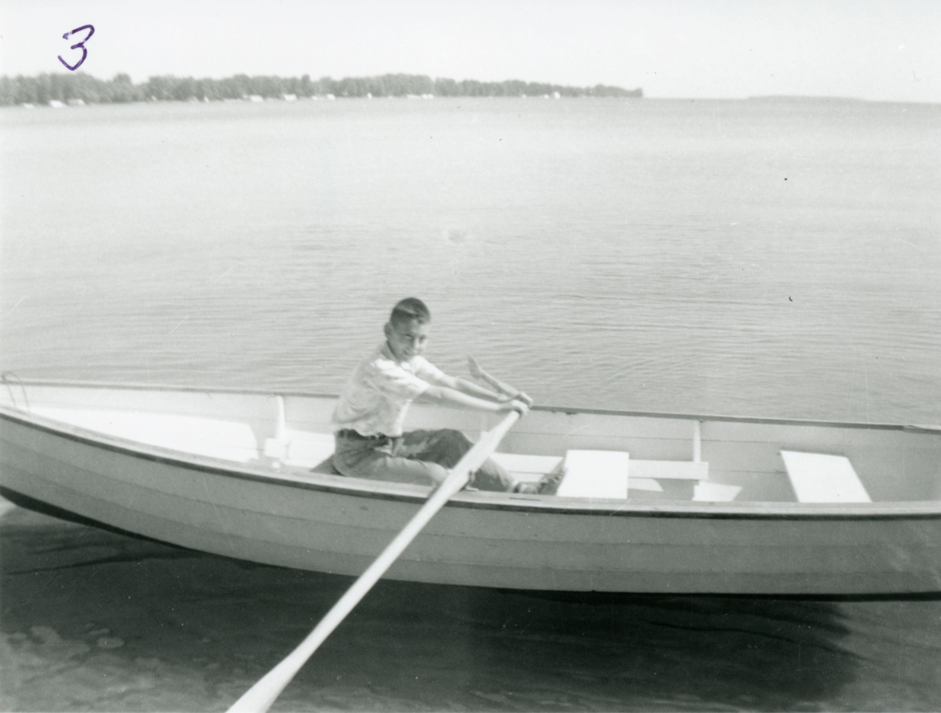 Photo of boy dressed in white shirt and slacks in white rowboat. Alfred Kwinter is in the rowboat of the Tom Murray family (wife: Dorothy, son: Wayne) on Lake Simcoe. Photo taken at Wayne Haven Cottage, Belle Ewart.