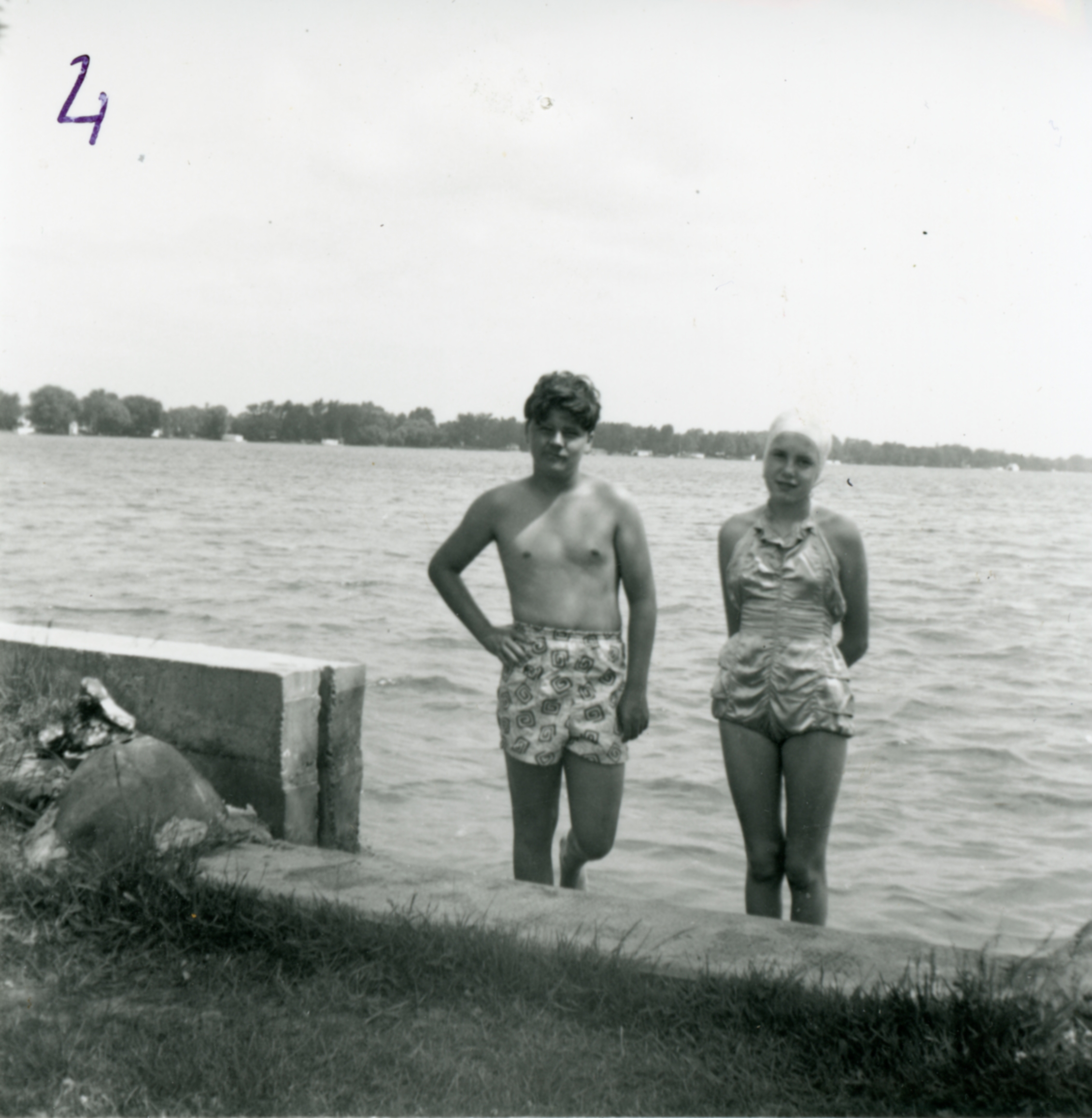 Wayne Murray, aged 15, son of Tom and Dorothy Murray and a friend, Patricia Bretney (age 14) stand in Cook's Bay, Lake Simcoe outside of the Murray Family Cottage "Wayne Haven". The shoreline in the background is Tent City which was located between the 5th and 6th Concessions. The shoreline of Cook's Bay encircled Belle Aire Beach. Murray is wearing swimming trunks and the girl next to him wears a ruffled swim suit and bathing cap. Wayne Murray was born on March 15, 1940.