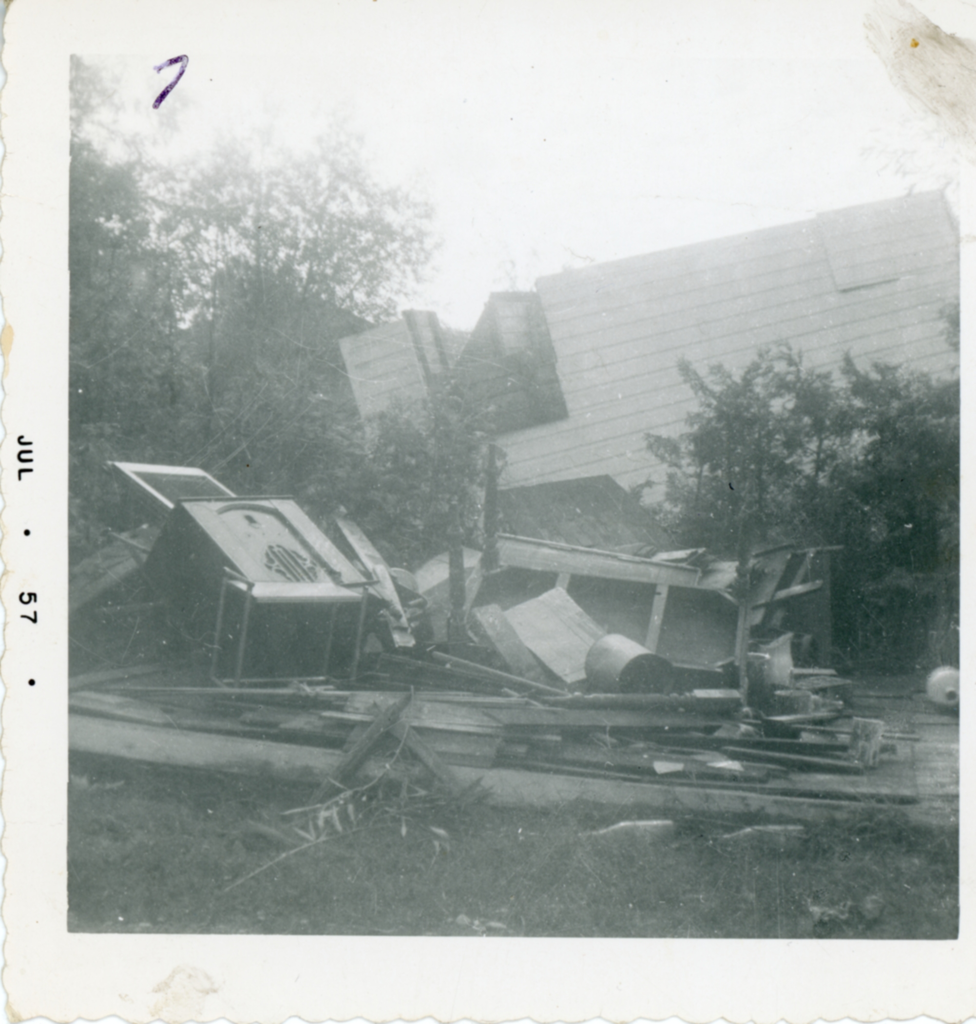 Image showing damaged garage building. Broken furniture and other debris can be seen in the foreground. On July 3, 1957 a storm that could have been a mini tornado struck the area of Belle Ewart. It was mentioned on the radio at the time that the bulk of the storm occurred between 4:00 and 6:00 pm. The ground was saturated from rain the last two weeks of June 1957. Heavy wind did a great deal of damage. According to the Murray family, roofs blew off, rowboats were blown into trees, neighbouring cottages of the Grossman Family had all their screens blown out and a garage was blown over. With no phone lines the people of the area lined up at Wark's Store to call fathers and husbands who had returned to work in Toronto. Due to the rain the water level of Lake Simcoe rose so high that it flowed over the break wall, covering lawns and roads.