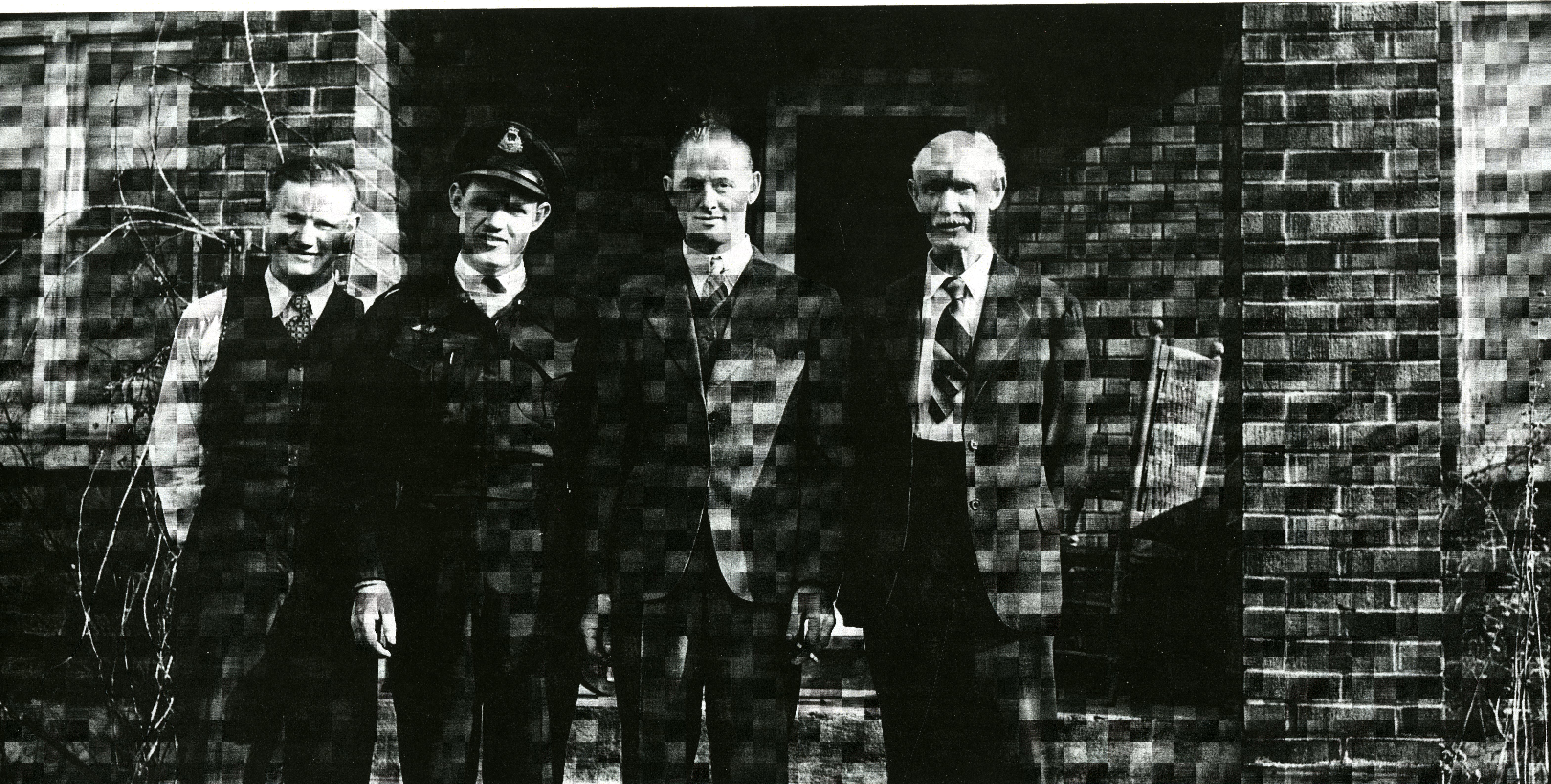 Photo of four men standing in front of a brick home on Sandy Cove Acres farm. From left to right they are identified as Matt Campbell wearing a suit without jacket, Bill Campbell in a police uniform, Hugh Campbell in a buttoned up three-piece suit and Father James Campbell in a suit as well, with the jacket open.