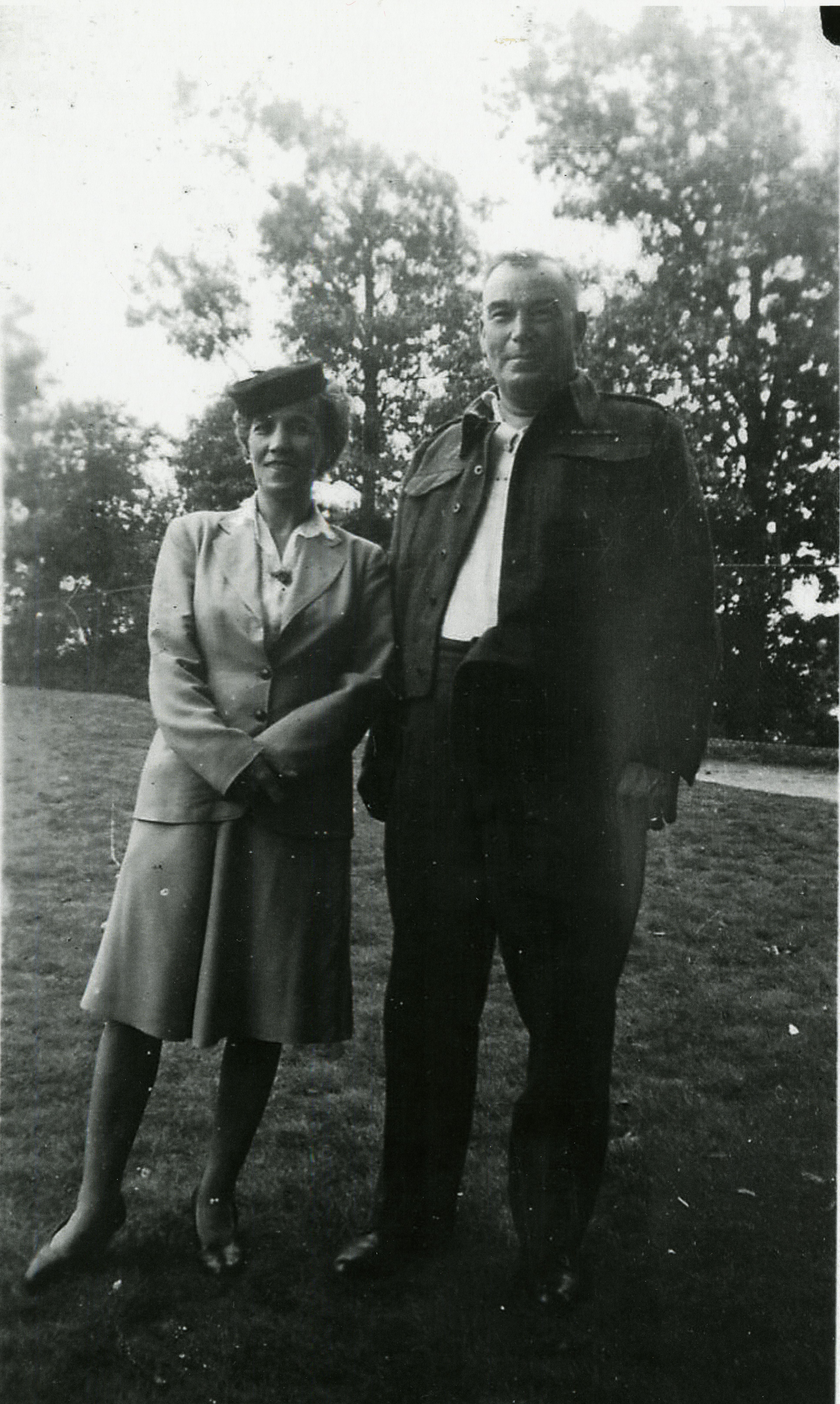 Photo of Sybil (Willoughby) and Joseph Stansfield outdooors in front of a treed background. Sybil is weraing a skirt, matching jacket and a pill box hat, Joseph wears what may be a military jacket. Joseph died in 1972, Sybil in 1993. Both are buried in Innisfil's 6th Line Cemetery. Circa 1945