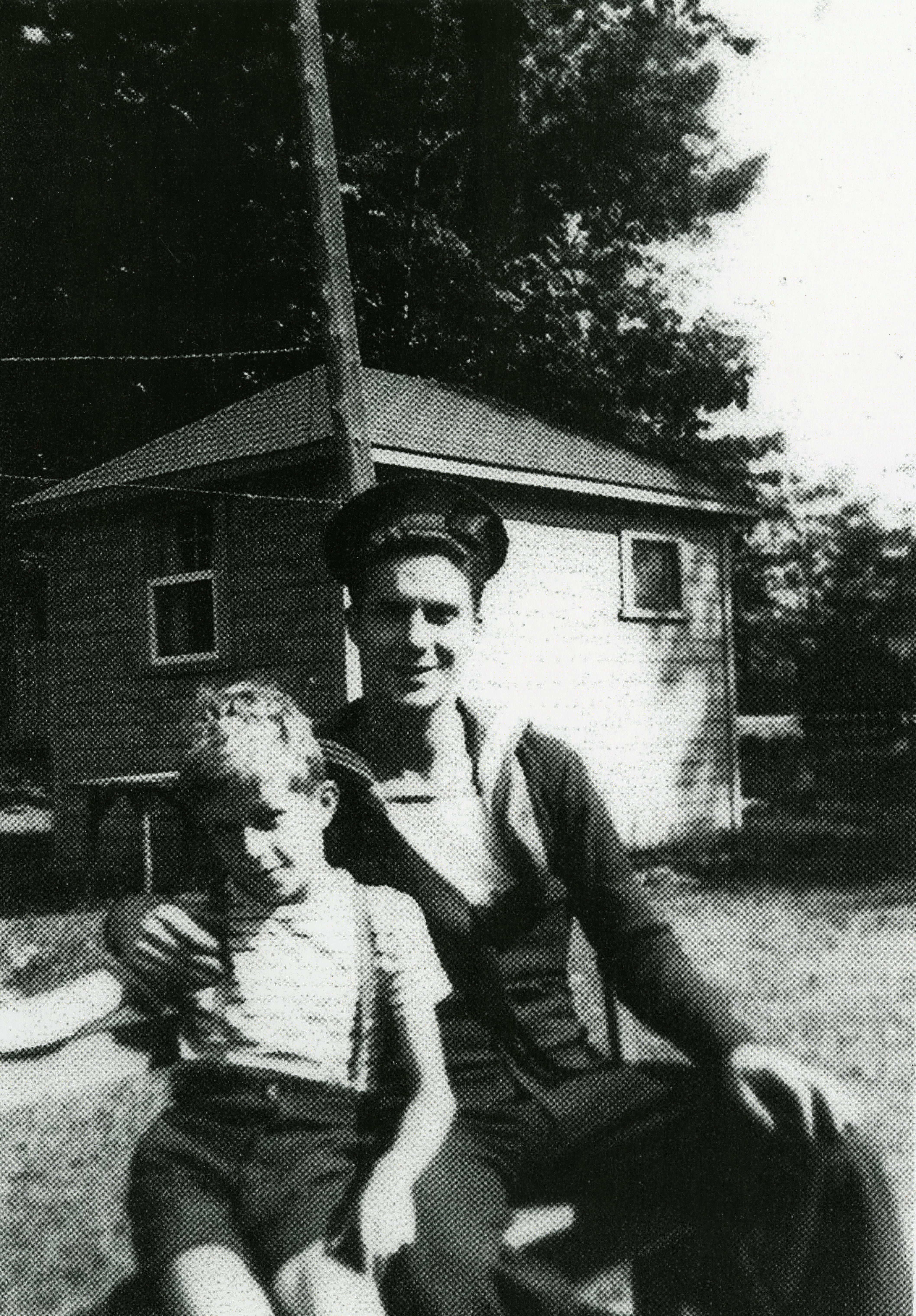 Photo of brothers Hilaire Jack (right) in a naval uniform and David Michael Jack in a striped t-shirt, shorts and suspenders in front of a small, square building. Hilaire (1920-1988) and David Michael (born early 1930s) were the sons of Herman and Margaret (Von Sliter) Jack. Hilaire served in the navy during WWII and visited his younger brother and family in Belle Ewart. Photo taken in early 1940s.