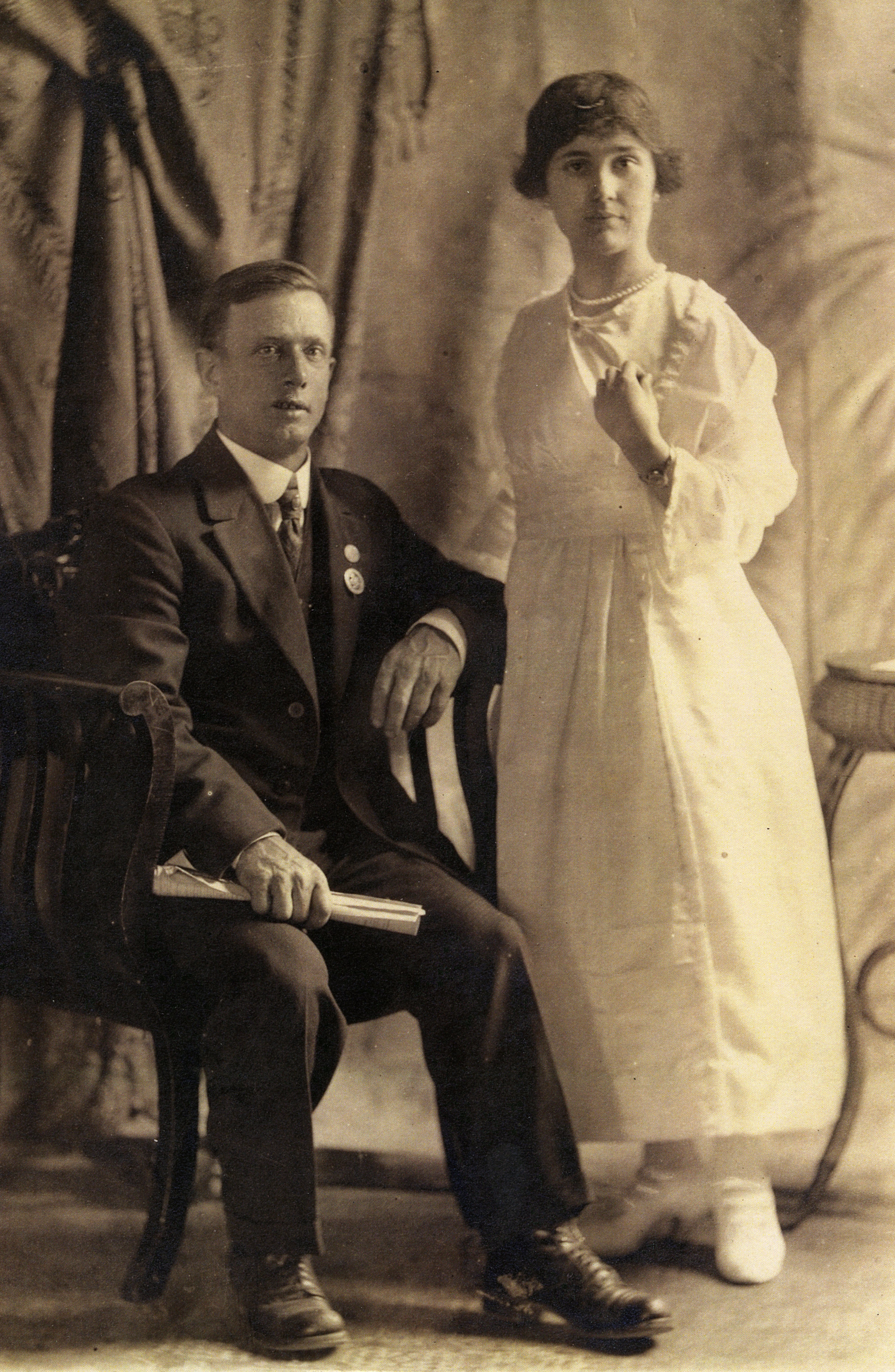 Wedding portrait of Henry "Harry" George Cannon and Ruby May Trumbley, 24 November 1919. Harry (1889-1947) came to Canada from Waddesdon, Buckinghamshire, England, about 1912. Before WWI Harry had met Ruby of Thornton-Cookstown area, daughter of Thomas Trumbley and Elizabeth Ann Crittenden. They married soon after Harry's overseas service in the First World War and settled in Churchill. They had three children: Douglas who died at the age of 12 in a bicycle accident, Muriel (later Mrs. C. Chambers) and Ella (Mrs. R. Patterson). Harry served in the 255th Battalion and 75th Battalion in World War One. Harry also served in the Veteran's Guard in World War Two. The photo shows Harry seated wearing a dark suit and holding a roll of papers, and Ruby May standing next to him in a white long sleeved gown.