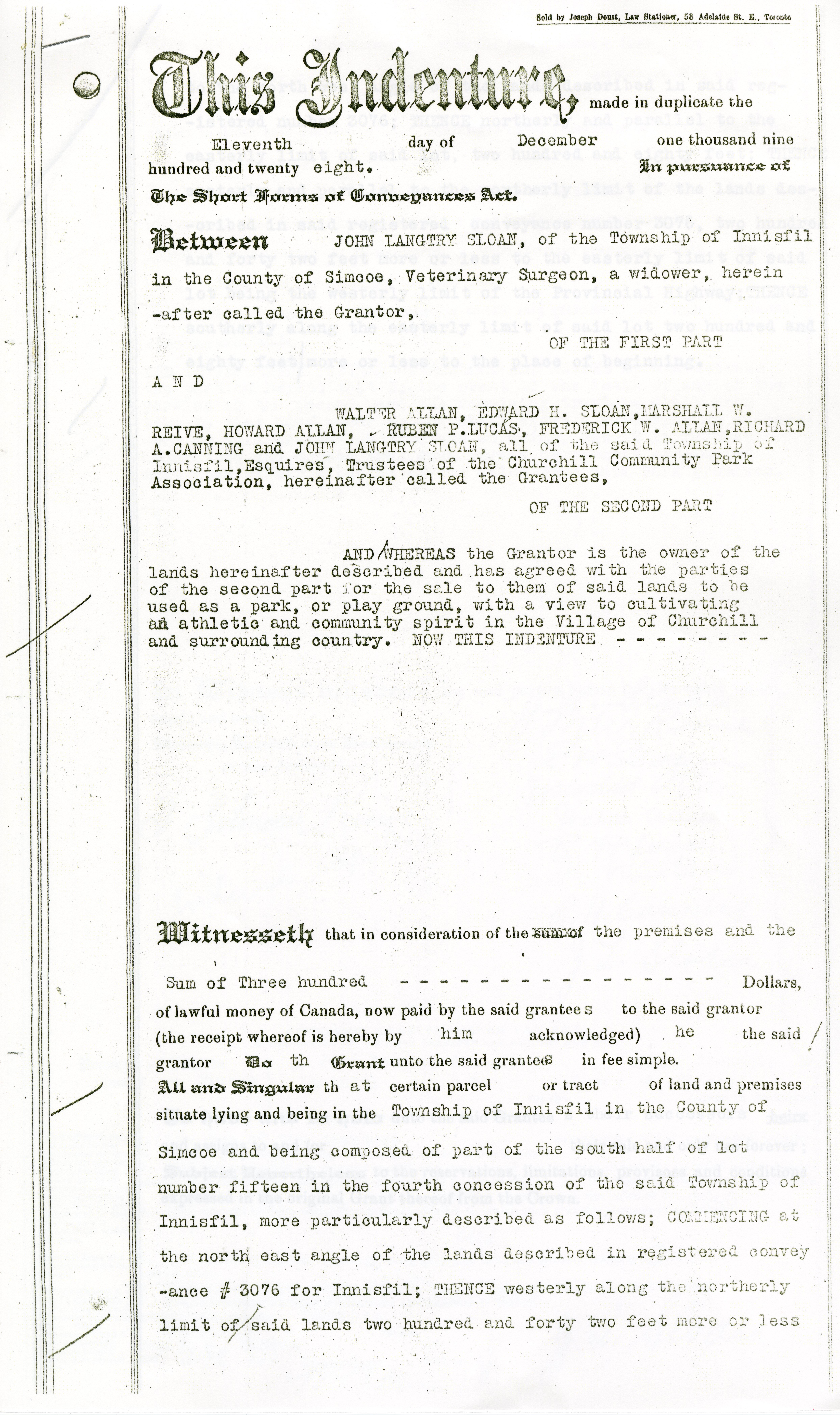 This Indenture document is a formal legal agreement between John Langtree Sloan and Trustees of Churchill Community Park. Trustees: Walter Allan, Edward H. Sloan, Marshall Reive, Howard Allan, Ruben Lucas, Frederick Allan, Richard Canning, John Sloan. The agreement was made Deember 11, 1928. John Langtree Sloan sold the land to be used as a community park for $300. The contract goes into great deatil about the size of the parcel of land.