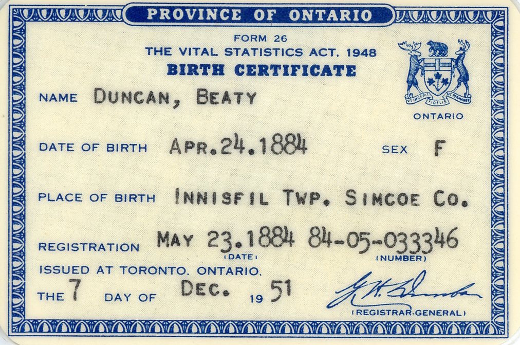 Scan of the birth certificate issued to Beaty (Beattie) Duncan, born on 24 April 1884 in Innisfil Township. Registration of her birth occurred on 23 May 1884, and the certificate itself was issued on 7 December 1951 in Toronto. The certificate is trimmed in a blue design and bears the coat of arms of the Ontario government. It is unknown why the name is spelled as "Beaty" on the certificate as her whole name was Agnes Beattie Duncan. She later married Alexander Constable on 20 November 1907.