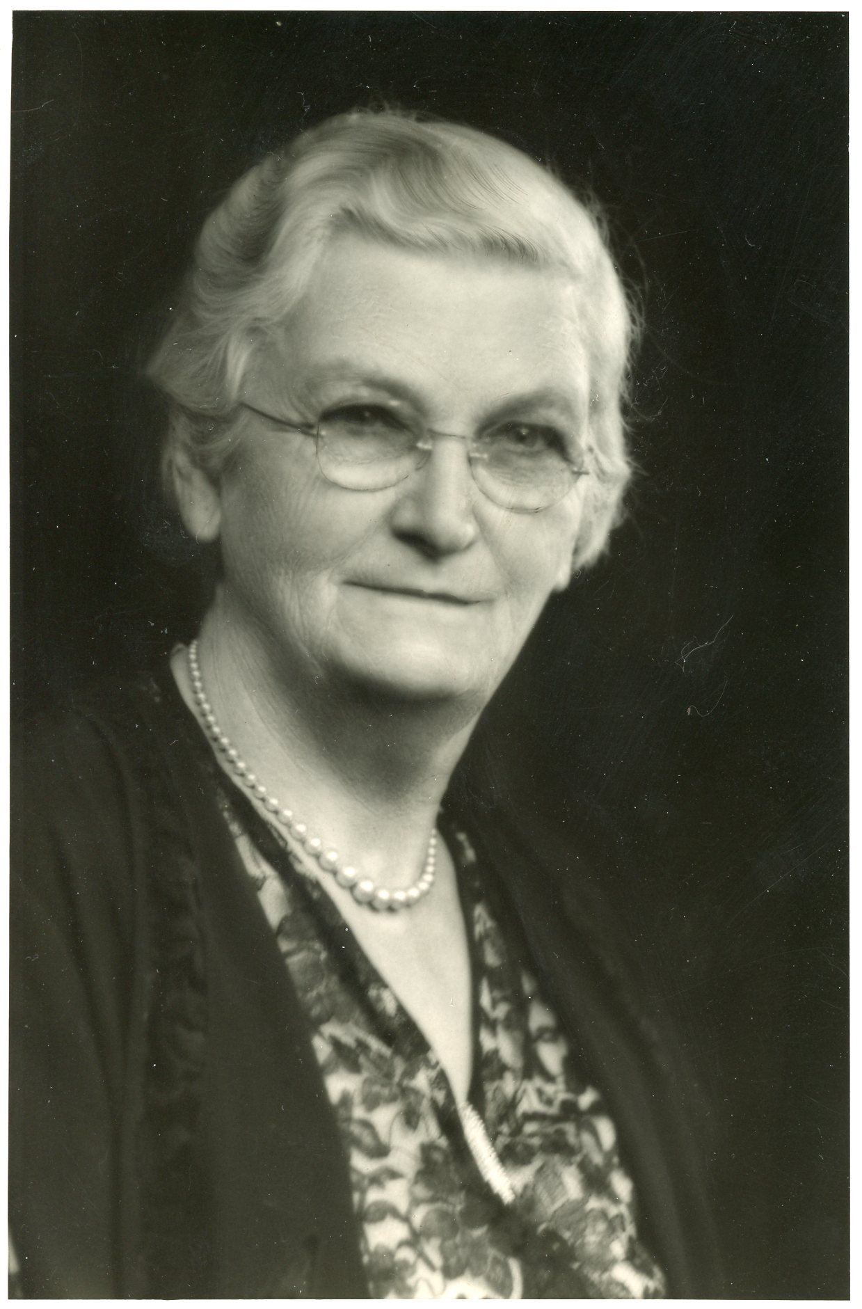 Portrait of Maria Louisa Barclay (née Nixon, known as Louise), who was Post Mistress and Deputy Post Mistress in Innisfil for forty years. She was married to John Barclay, and their children were Georgia, David "Dee", Kathleen "Kit", Eleanor "Zeta", and Margaret. The portrait was produced by New Paramount Studios in Toronto and shows an older Louise wearing a floral shirt and cardigan, pearl necklace, glasses, and a short hairstyle.