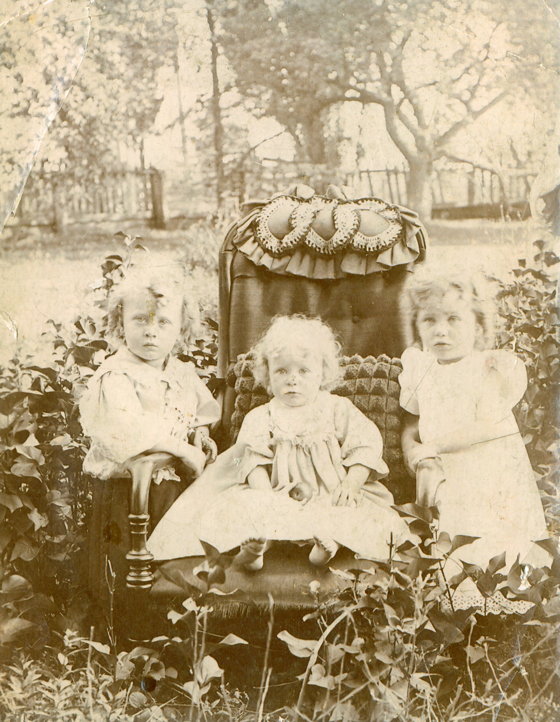 Portrait of three young children in gowns posed outdoors around an antique chair. From left to right are Durbin Nixon, aged 3, Lucy Nixon, aged 1, and Margaret Armstrong McConkey Barclay, aged 3. The photo was taken in 1899