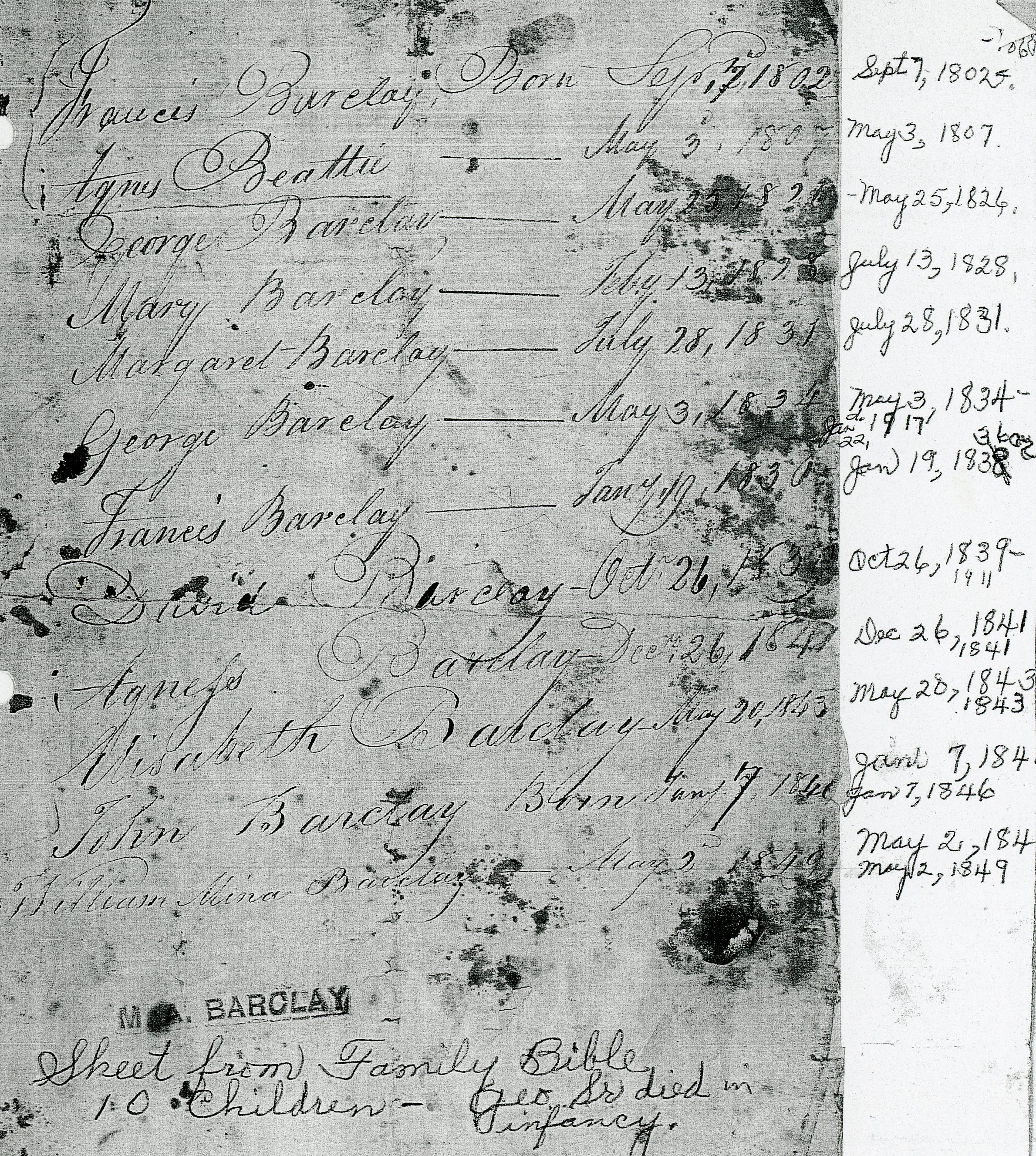 Scan of a page of the Francis and Agnes (née Beattie) Barclay family bible, which lists the birth dates of their ten children as well as their own. The list contains two separate entries for George Barclay, which is correct. The first was born on 25 May 1826 in Canonbie, Dumfriesshire, Scotland, and died on 11 February 1831. He was buried in the Canonbie Kirkyard in plot 483. Another son born in 1834 was also given the name George.
