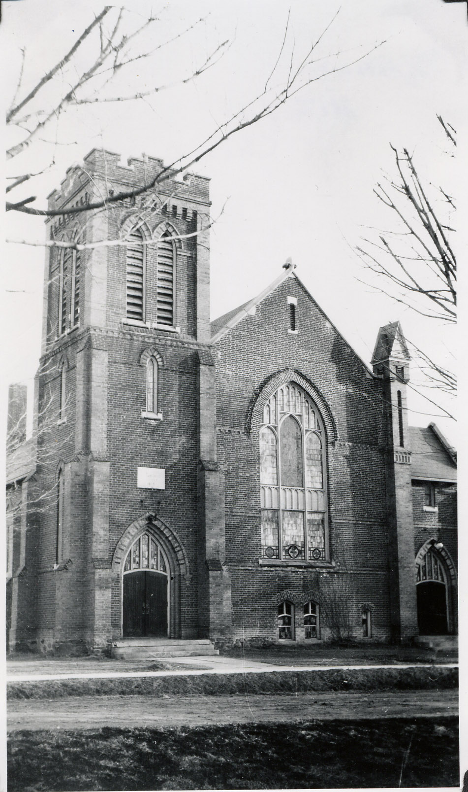 Photo of the exterior of Cookstown United Church. Originally the Cookstown Methodist Church, it was built in 1878, destroyed by fire in 1914, and rebuilt in 1915. After the church union between the Methodist Congregational and Presbyterian churches in 1925 it became the Cookstown United Church. The photo shows the front entrance with dark doors, and a large stained glass window several storeys high.
