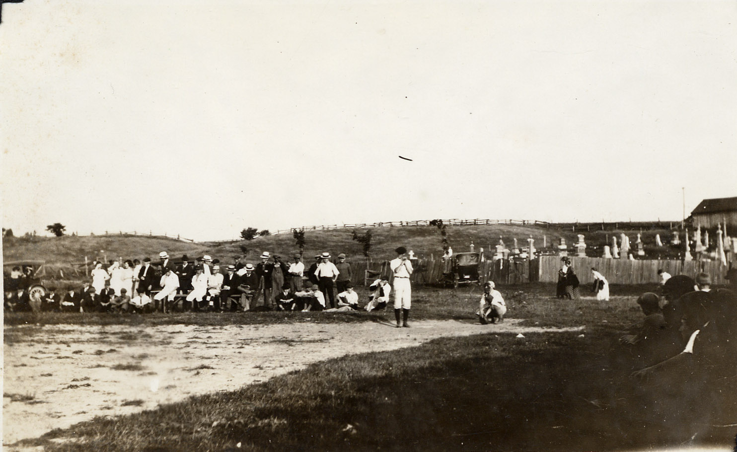 Photo of a baseball game played by Cookstown's baseball team in the early twentieth century. The players are wearing white uniforms with dark caps, and the spectators are standing behind the players' bench or sitting on the ground beside it. Many of the men are wearing boater caps. St. John's Cemetery is visible in the background indicating that the photo was taken on or near the fairgrounds.