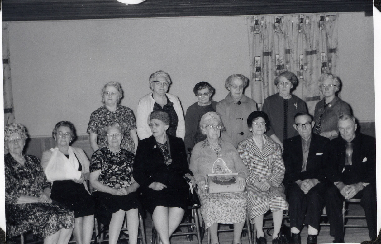 Photograph of a group of people enjoying some entertainment provided by the Cookstown Women's Institute in 1965. Pictured from left to right in the back row are: Mrs. Lily Fisher, Mrs. Walter Wright, Mrs. Sam Nevils, Miss Mabel Moir, Mrs. Clarence Cooper, and Mrs. Reuben Glass. Front row: Mrs. Chas. Hounsome, Mrs. Clara Warner, Mrs. Wm. Carr, Mrs. Art Shaw, Mrs. Powers Sr., Mrs. Ross Elliott, Mr. Ross Elliott Sr., and Mr. Charles Hounsome. The back row is standing while the front row is seated in chairs. The gentlemen are dressed in suits and the ladies are wearing dresses as well as coats or cardigans, and several are wearing hats. The photo was taken indoors.