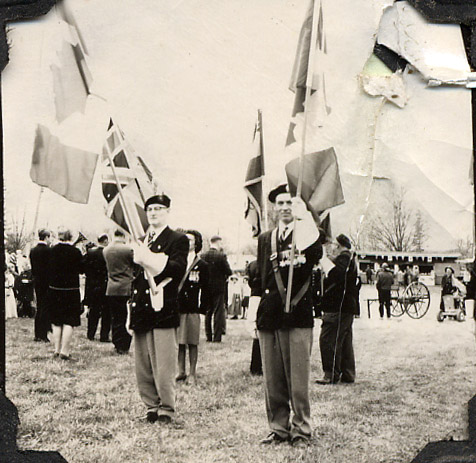 Legion flag bearers and members lining up in front of the Curling Rink for the Opening Ceremony. George Sharp and Don Elines